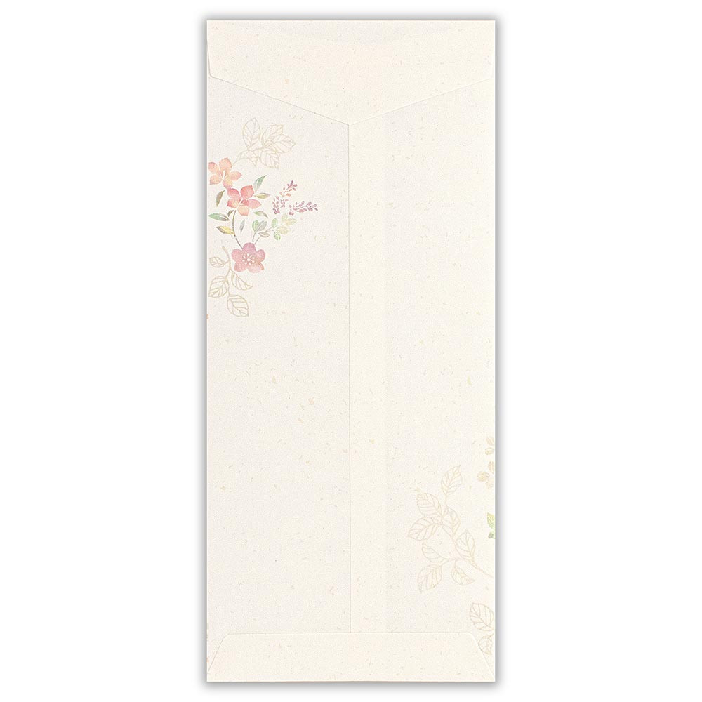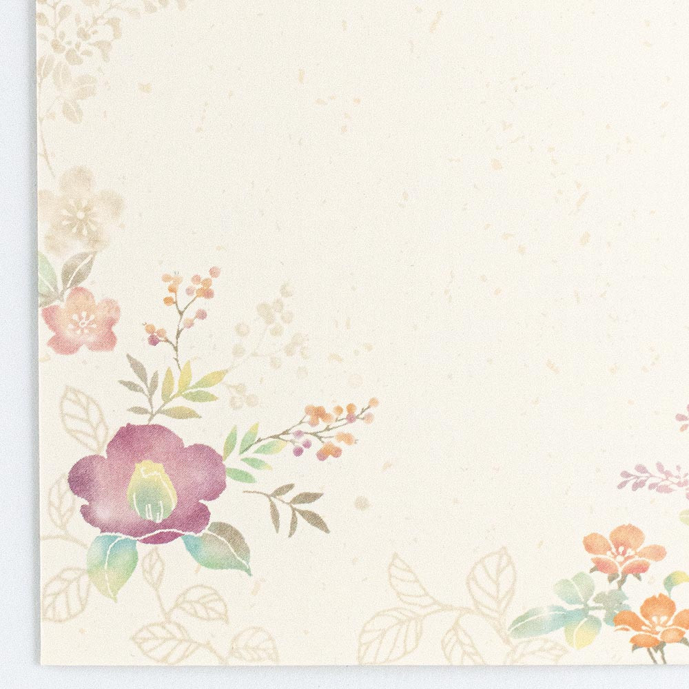 桜・アジサイ・桔梗・椿など四季の和花を優しい色合いで描いた上品で使いやすい和紙封筒です。通年お使い頂けます。