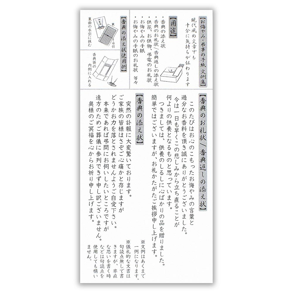 <用途>香典の添え状/香典のお礼状・香典返しの添え状/供花・お供物・弔電のお礼状/お悔やみの手紙/お悔やみの手紙のお礼状等
