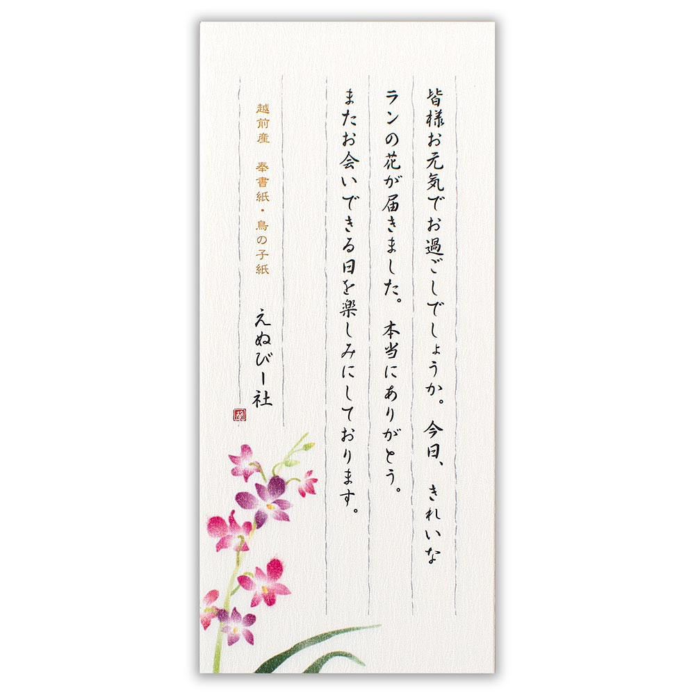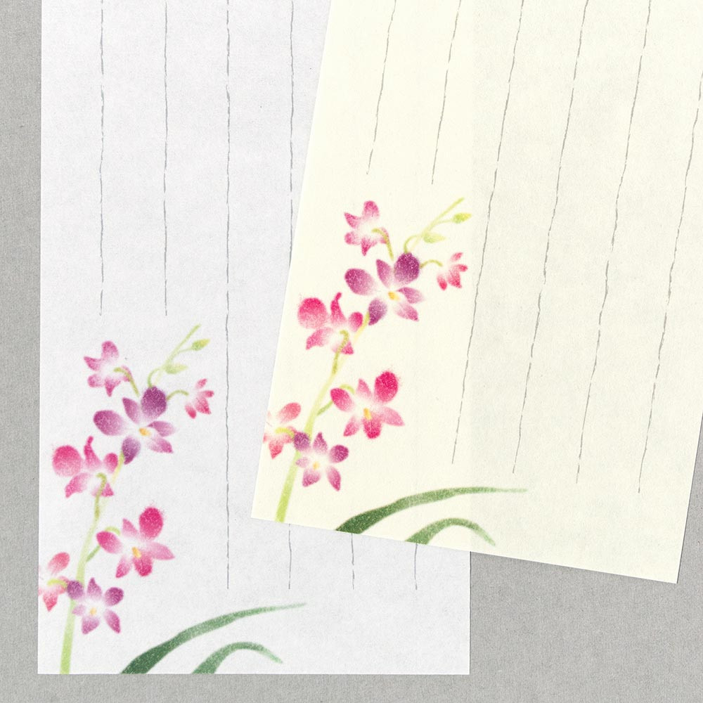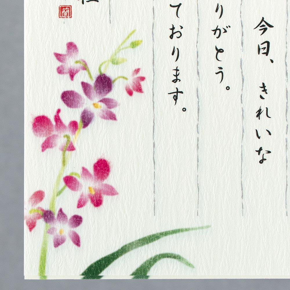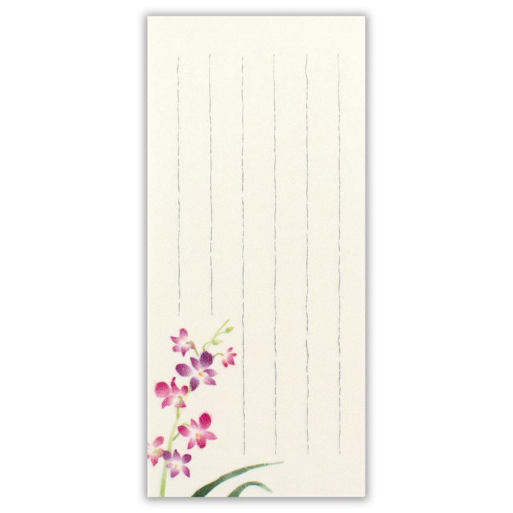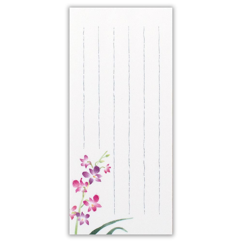 艶やかなデンファレ(洋ラン)の絵柄が入った2色の和紙をアソートした一筆箋です。