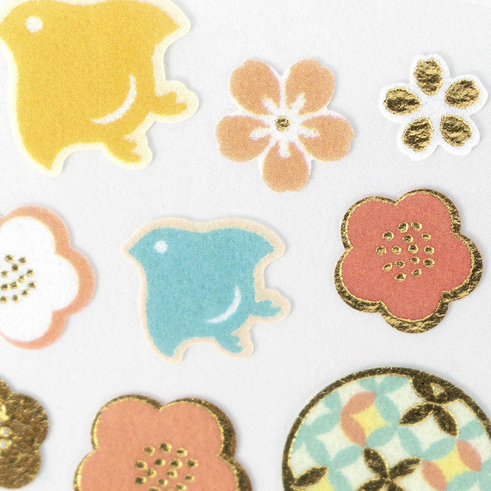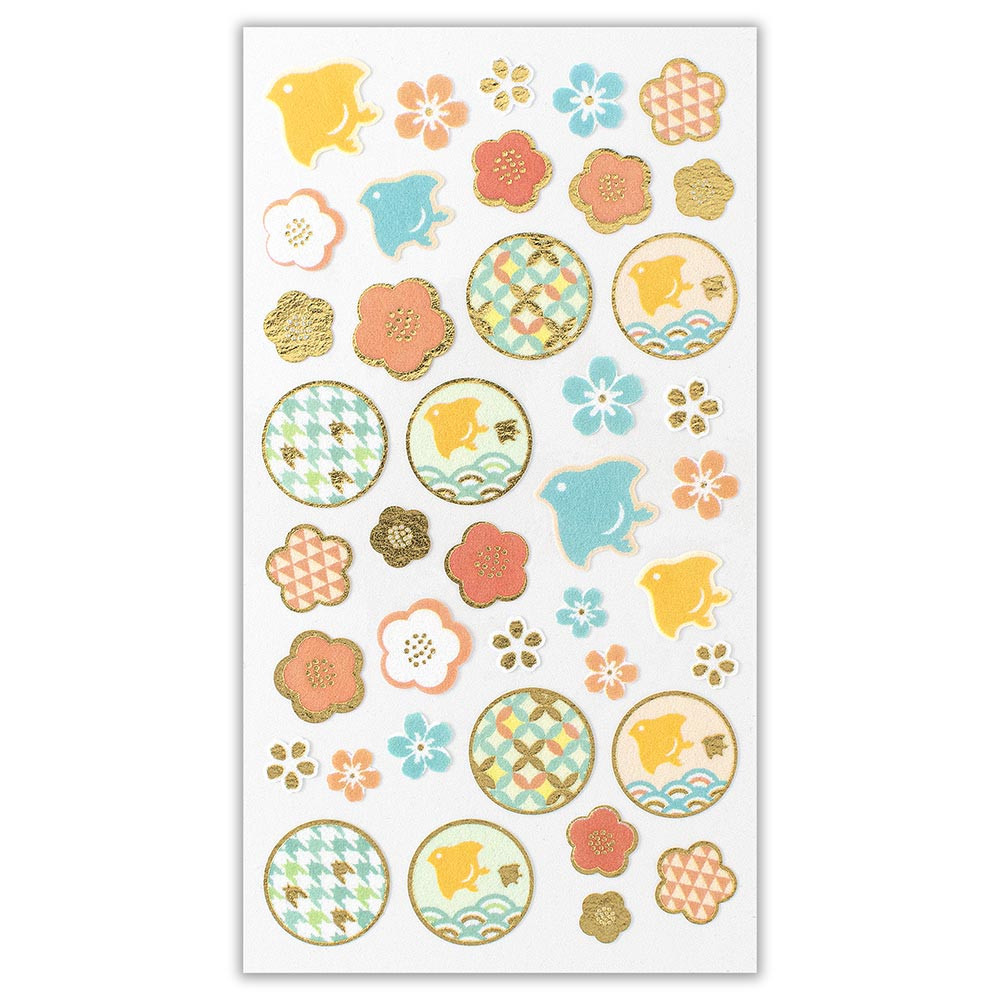 不織布の風合いと手触りが優しい、きらりと金箔が輝くシールです。千鳥や七宝など縁起の良い和柄をカラフルにデザインしました。