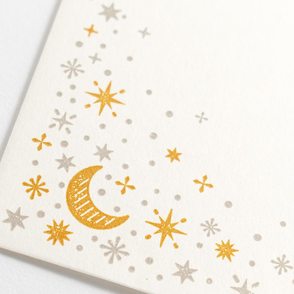 活版印刷は、凸状の版を使い圧をかけて紙にインクを転写する昔ながらの印刷技法です。活版印刷ならではのインクの滲み(にじみ)やかすれ具合など、一枚一枚異なる風合いをお楽しみください。