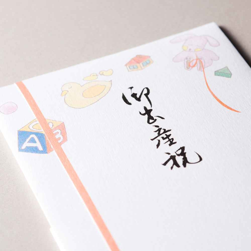 出産祝いの御祝儀袋です。優しい色づかいで描かれたおもちゃが御祝の気持ちをお包みします。水引付きよりも、気負わずさりげなくお贈りいただけます。