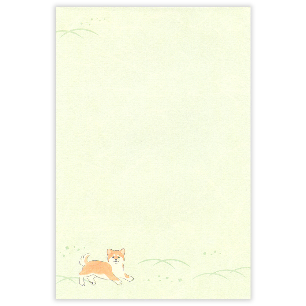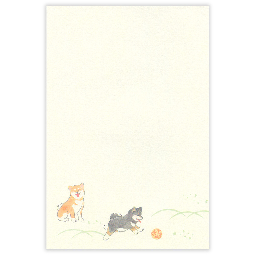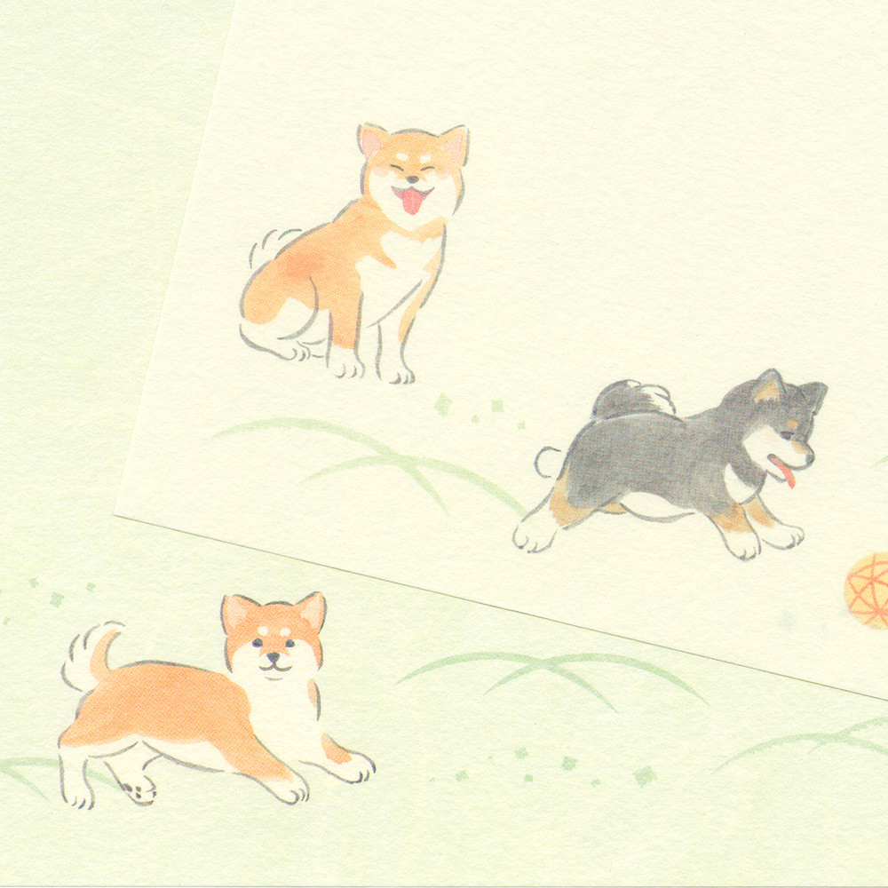 柴犬たちの和やかな表情を優しいタッチで描いた、2柄アソートの和紙便箋です。 柴犬がお好きな方へのお手紙にもおすすめです。
