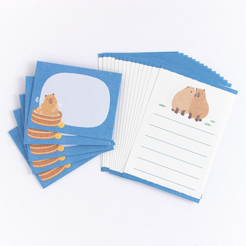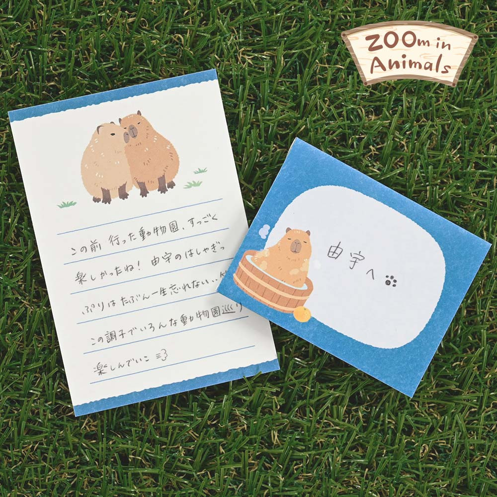 仲間たちとのんびり過ごすカピバラを描いた小たよりです。