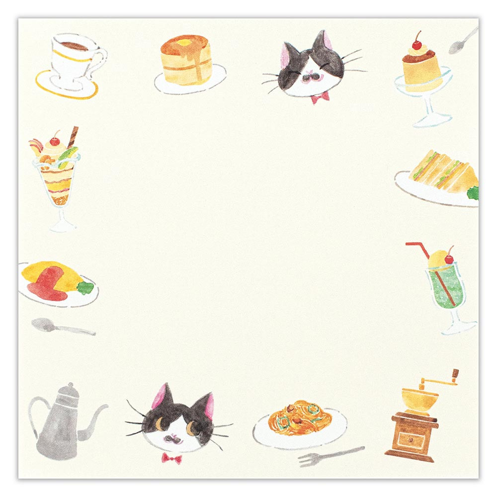 レトロ喫茶のハチワレ店主猫・茂三郎と、昔懐かしい喫茶メニューを描いたメモです。