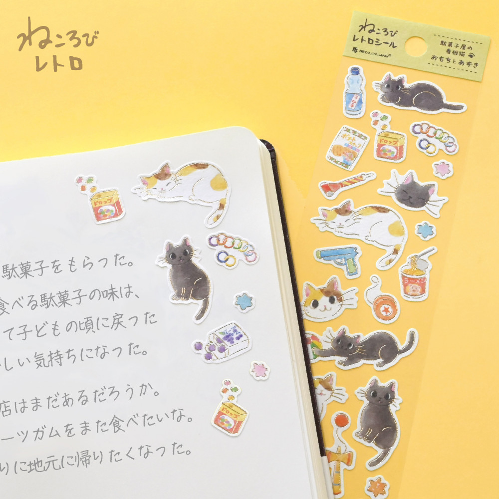 昔懐かしい駄菓子屋看板猫のおもちとあずきと、お菓子やレトロなおもちゃを描いたシールです。