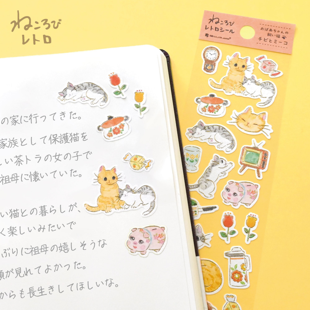 レトロ家電や家具がいっぱいの家に住む、おばあちゃんの飼い猫チビとミーコを描いたシールです。