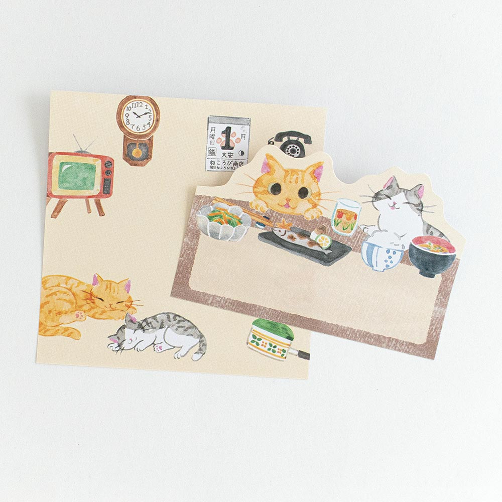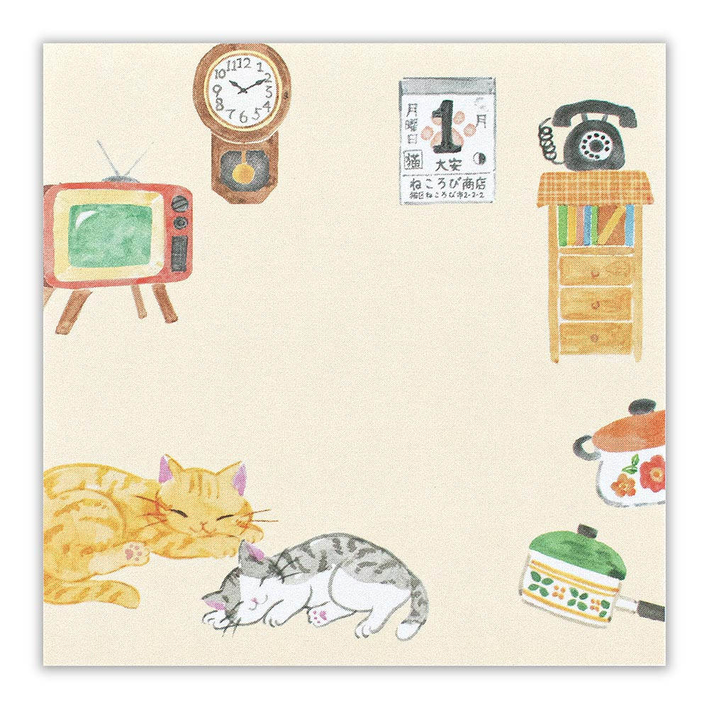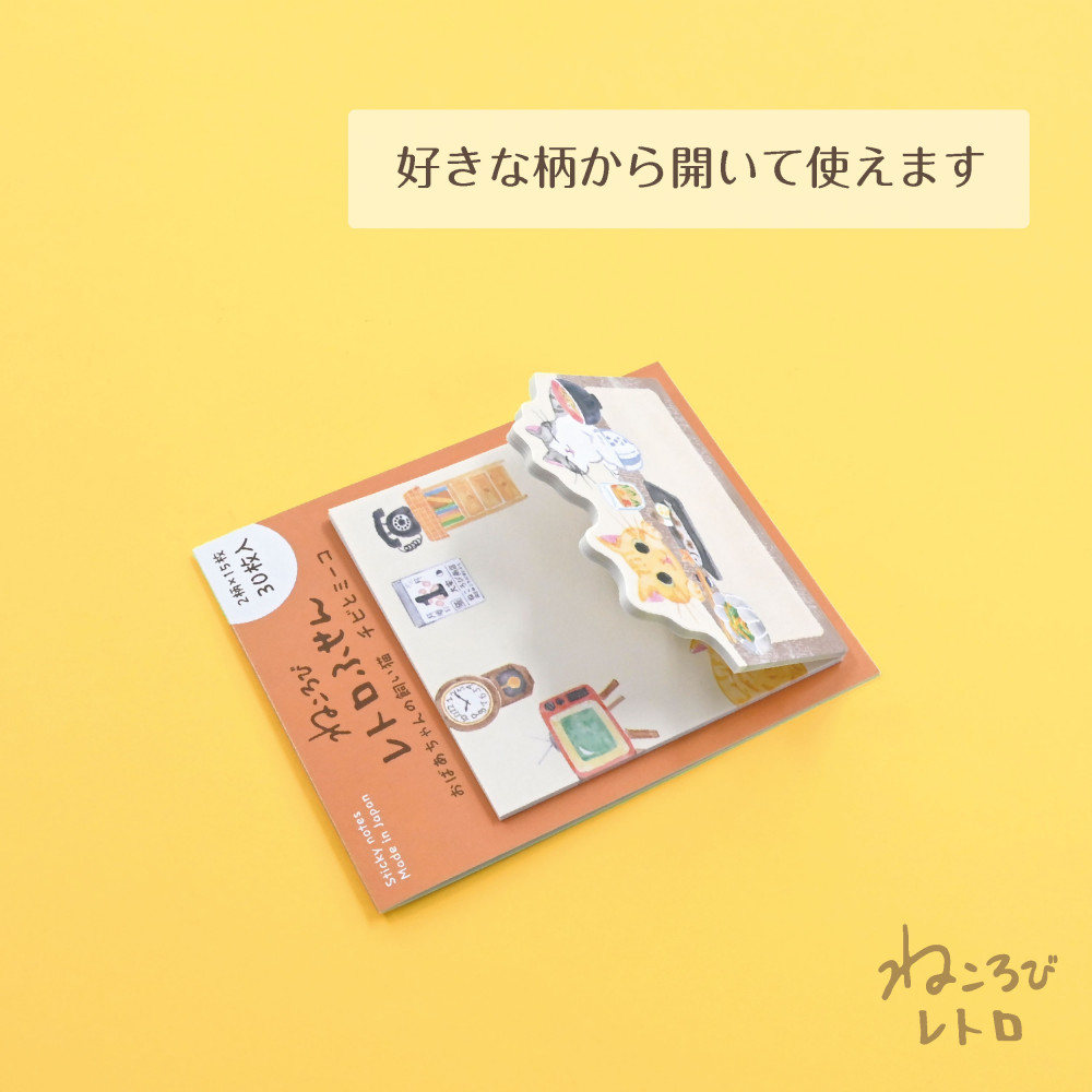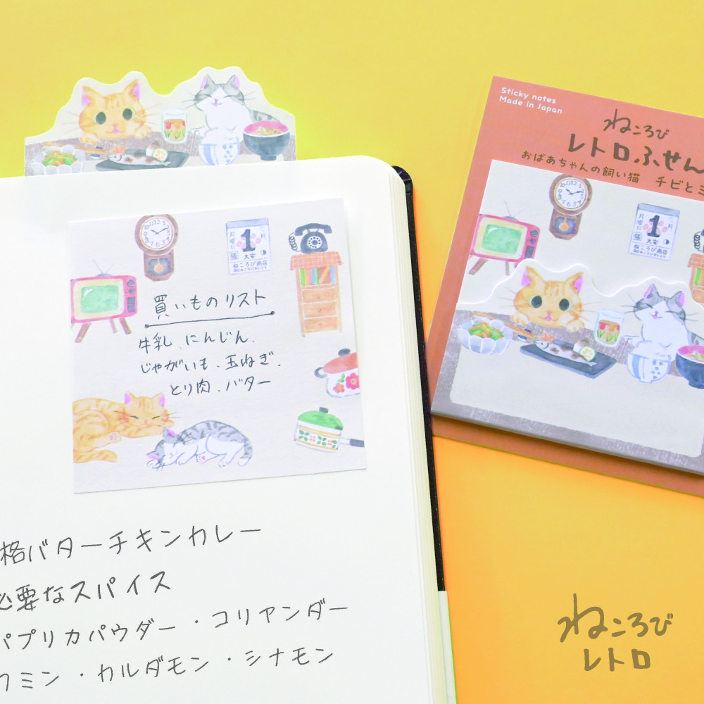 レトロ家電や家具がいっぱいの家に住む、おばあちゃんの飼い猫チビとミーコを描いたふせんです。
