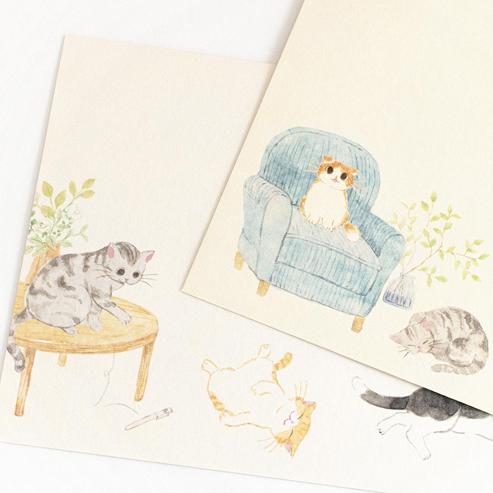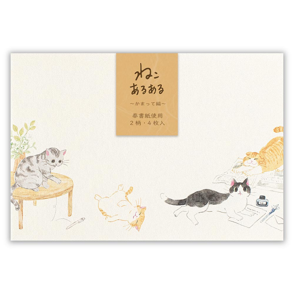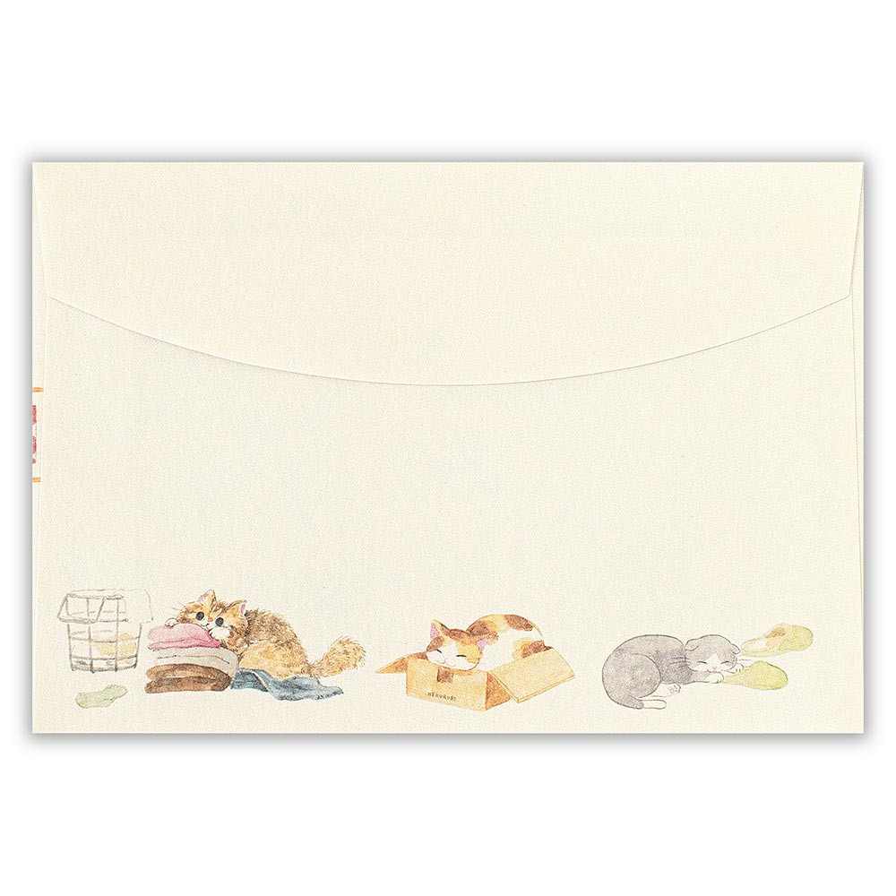 ものを落としたり、本に乗ったり‥‥ちょっとお邪魔だけど憎めない、ねこあるあるシーンを描いた封筒です。