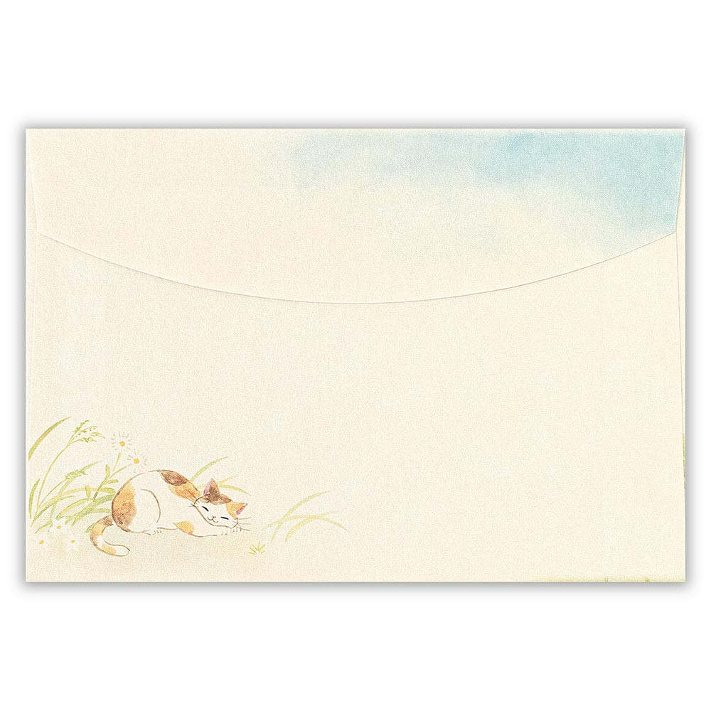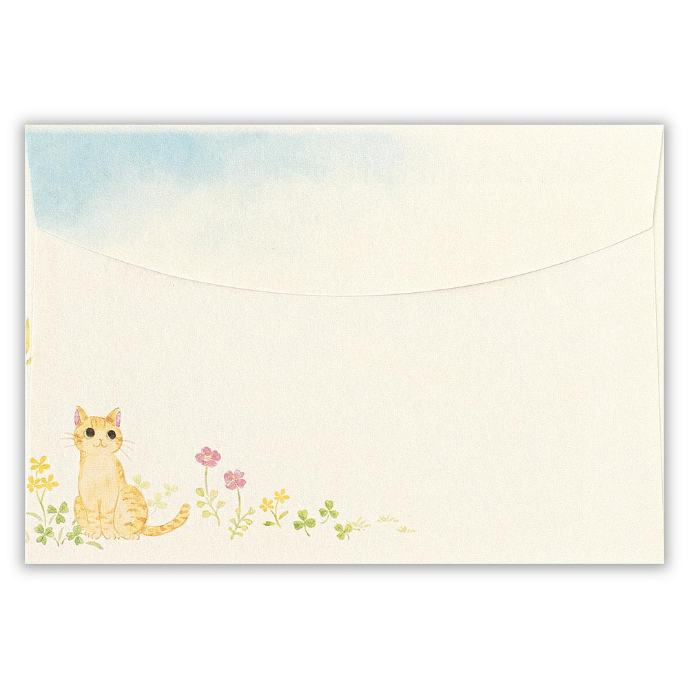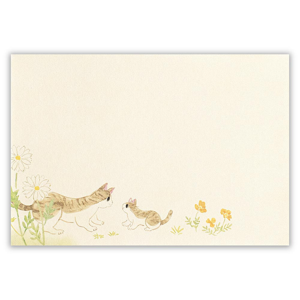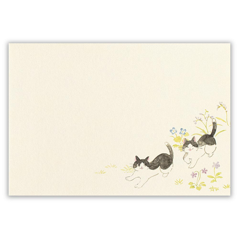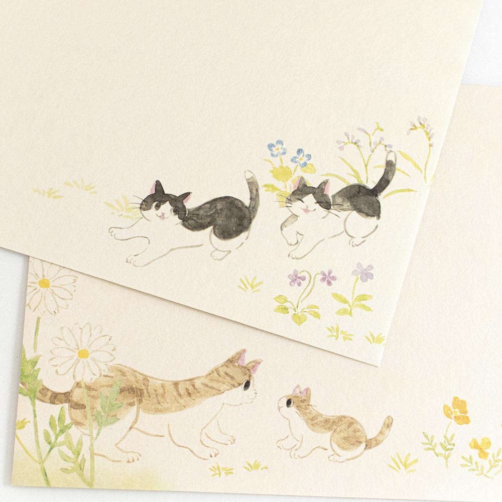 野原で自由に生きる猫たちを描いた封筒です。 さまざまな野の花を描いた、通年使えるデザインです。