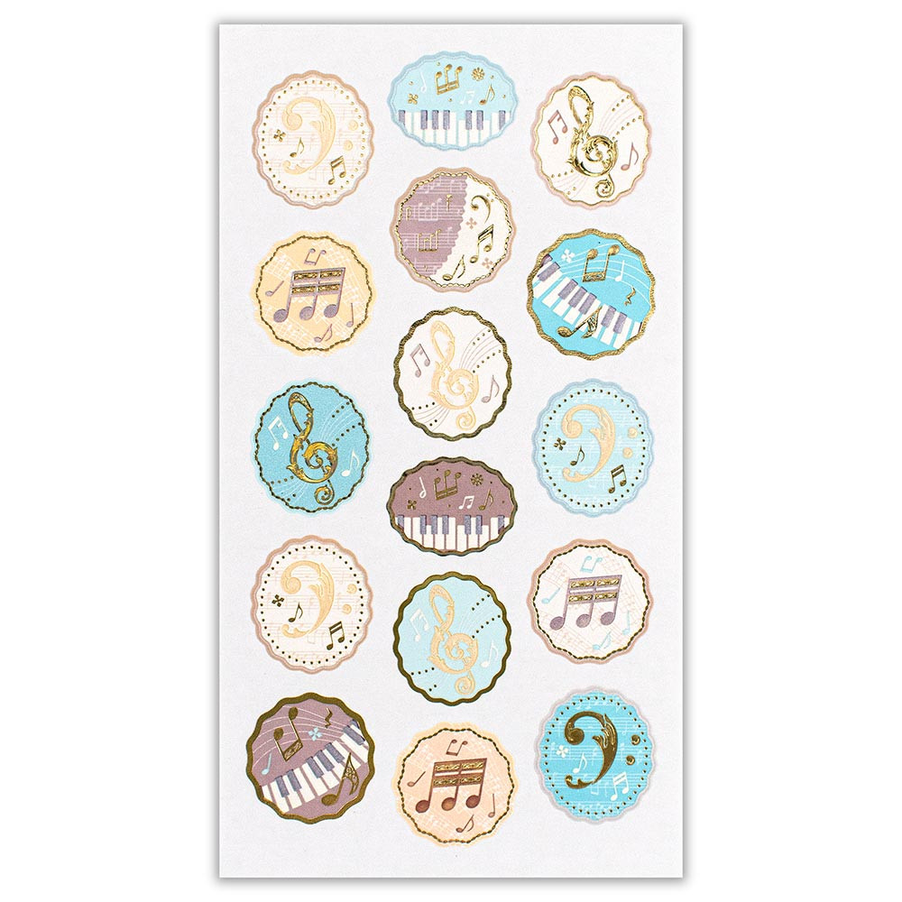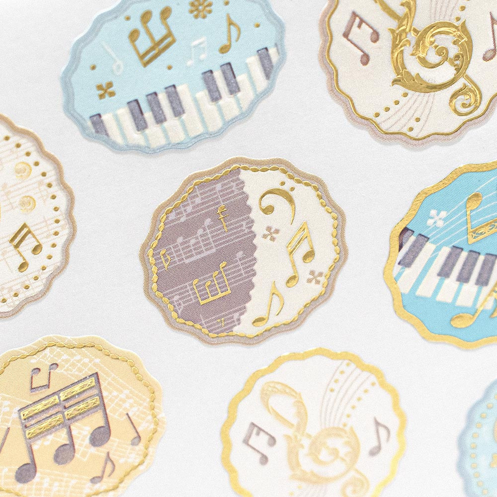 パールと金箔の上品な輝きと、エンボスの立体感がエレガントな音楽柄の封緘シールです。飾りを施した音符やピアノの鍵盤が華やかな印象で、音楽好きな方へのお手紙におすすめです。