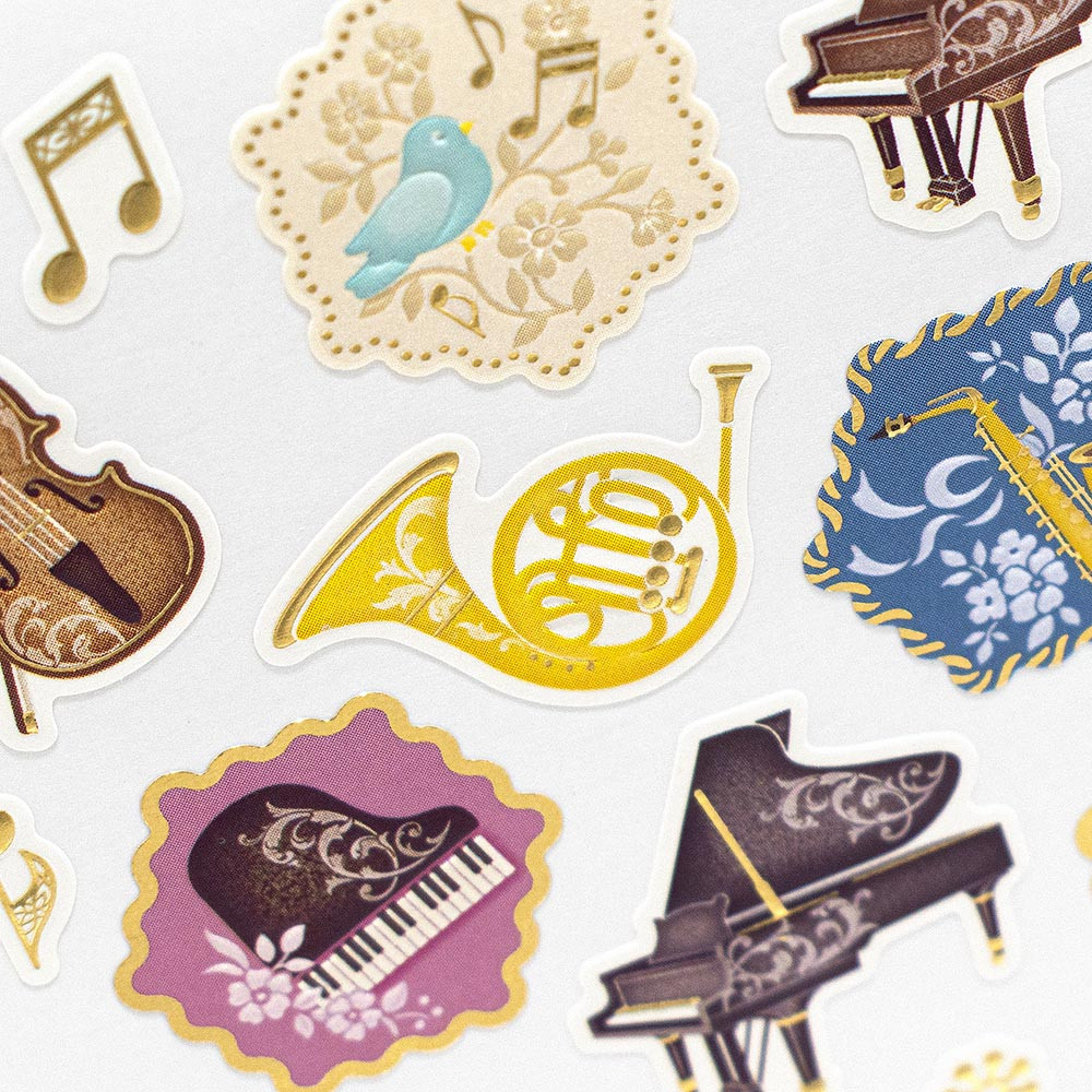 パールと金箔の上品な輝きと、エンボスの立体感がエレガントな音楽柄のシールです。ピアノやバイオリンなどの楽器や音符が華やかな印象で、音楽好きな方へのお手紙におすすめです。