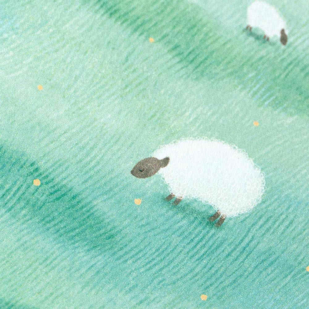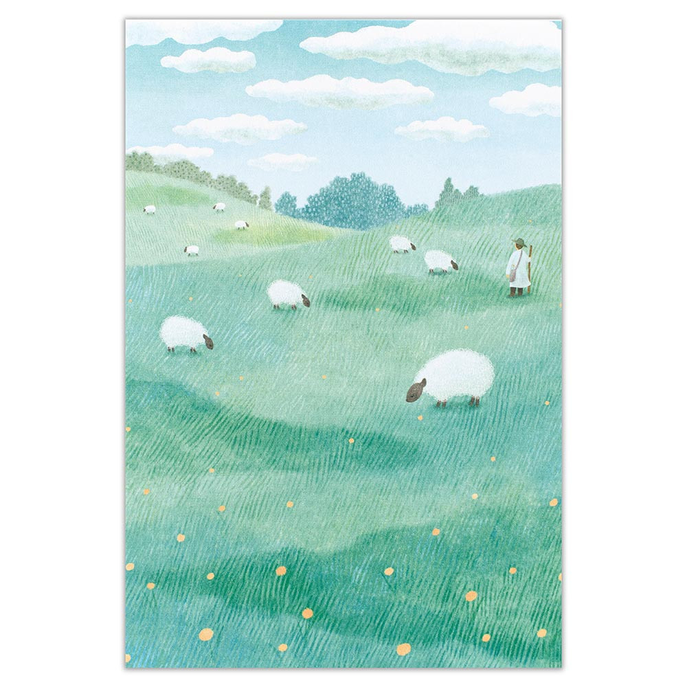 羊や広がる空を描いた高原の風景のデザインです。