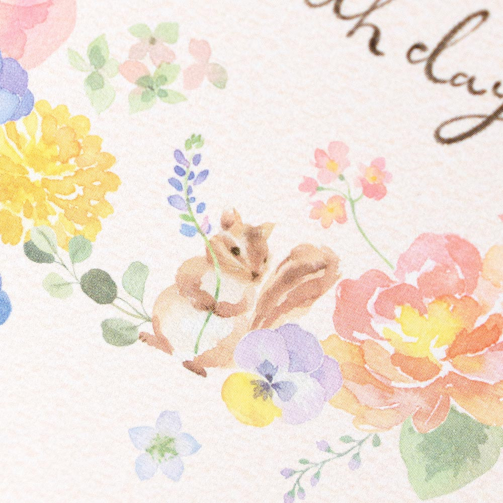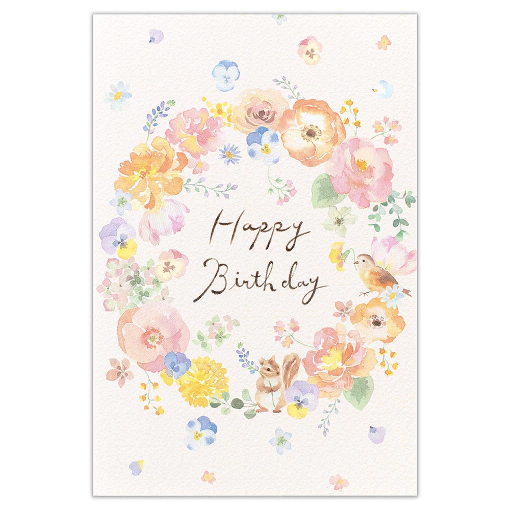 華やかなお花のリースとふんわり可愛らしい動物たちがお誕生日のお祝いにぴったりなデザインです。