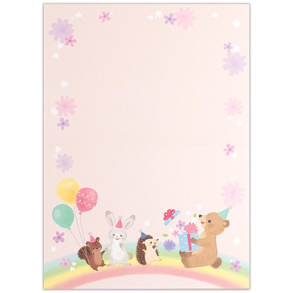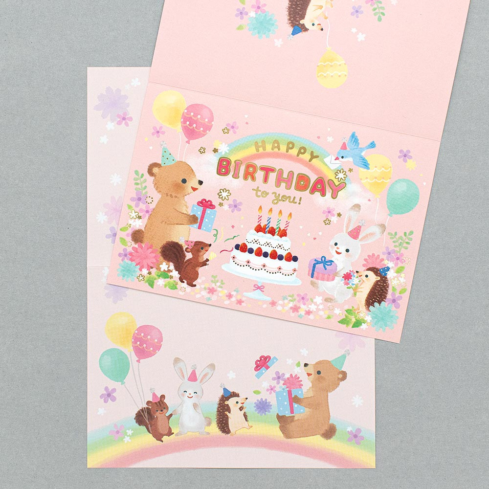 クマやリス、ウサギ、ハリネズミ、鳥といった動物たちがプレゼントを持ち寄り、にぎやかに誕生日パーティーを開いています。