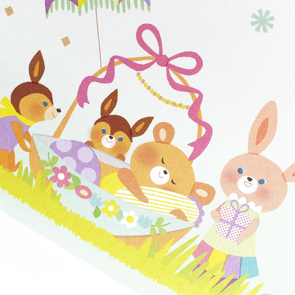 動物たちが赤ちゃんぐまをお祝いする姿が賑やかに描かれています。