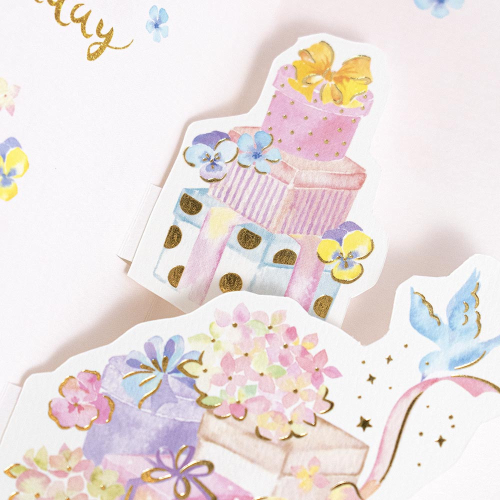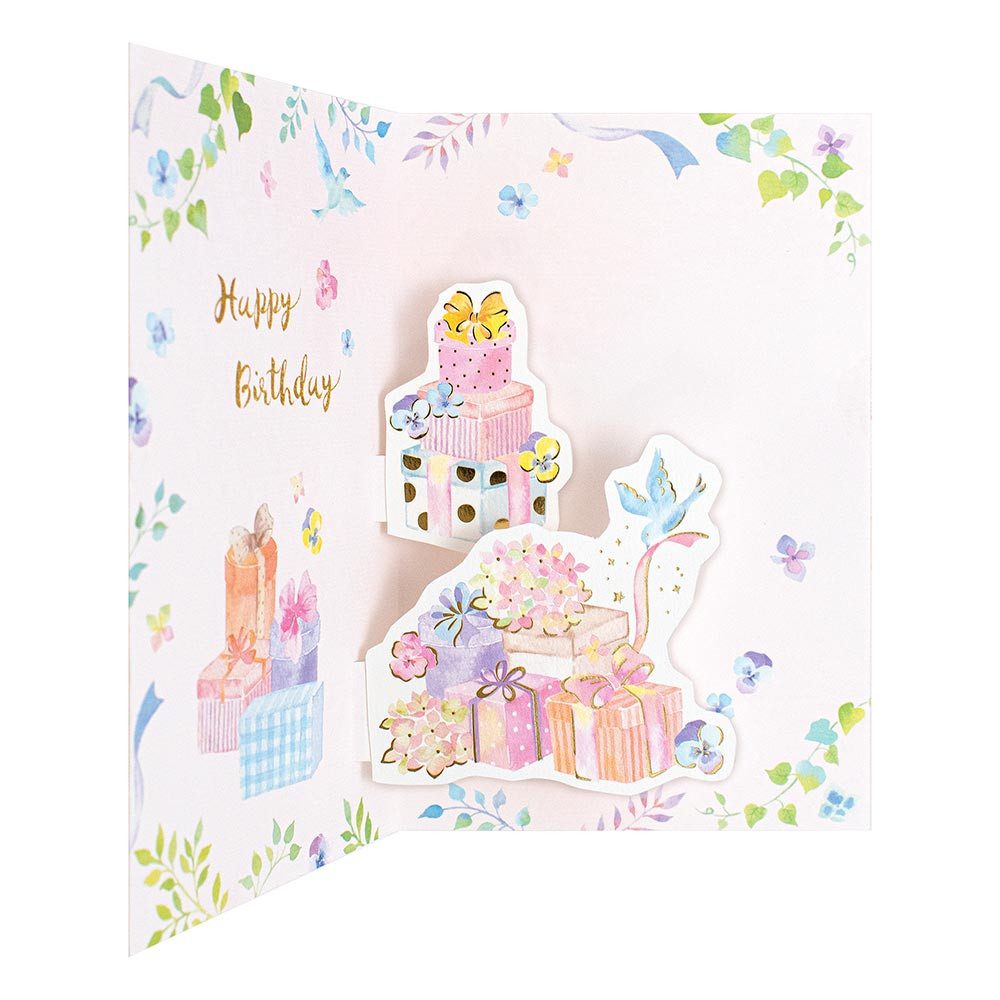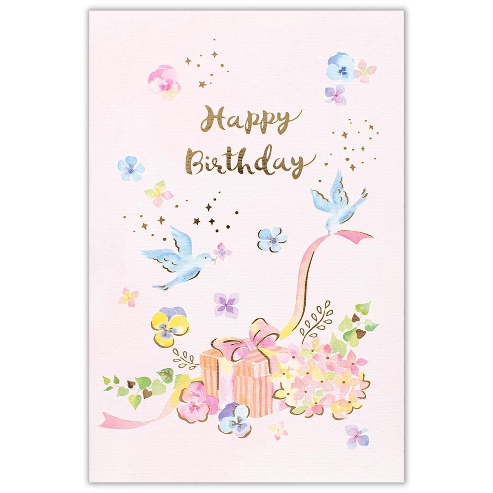 カラフルなプレゼントと小鳥たちが上品に描かれています。