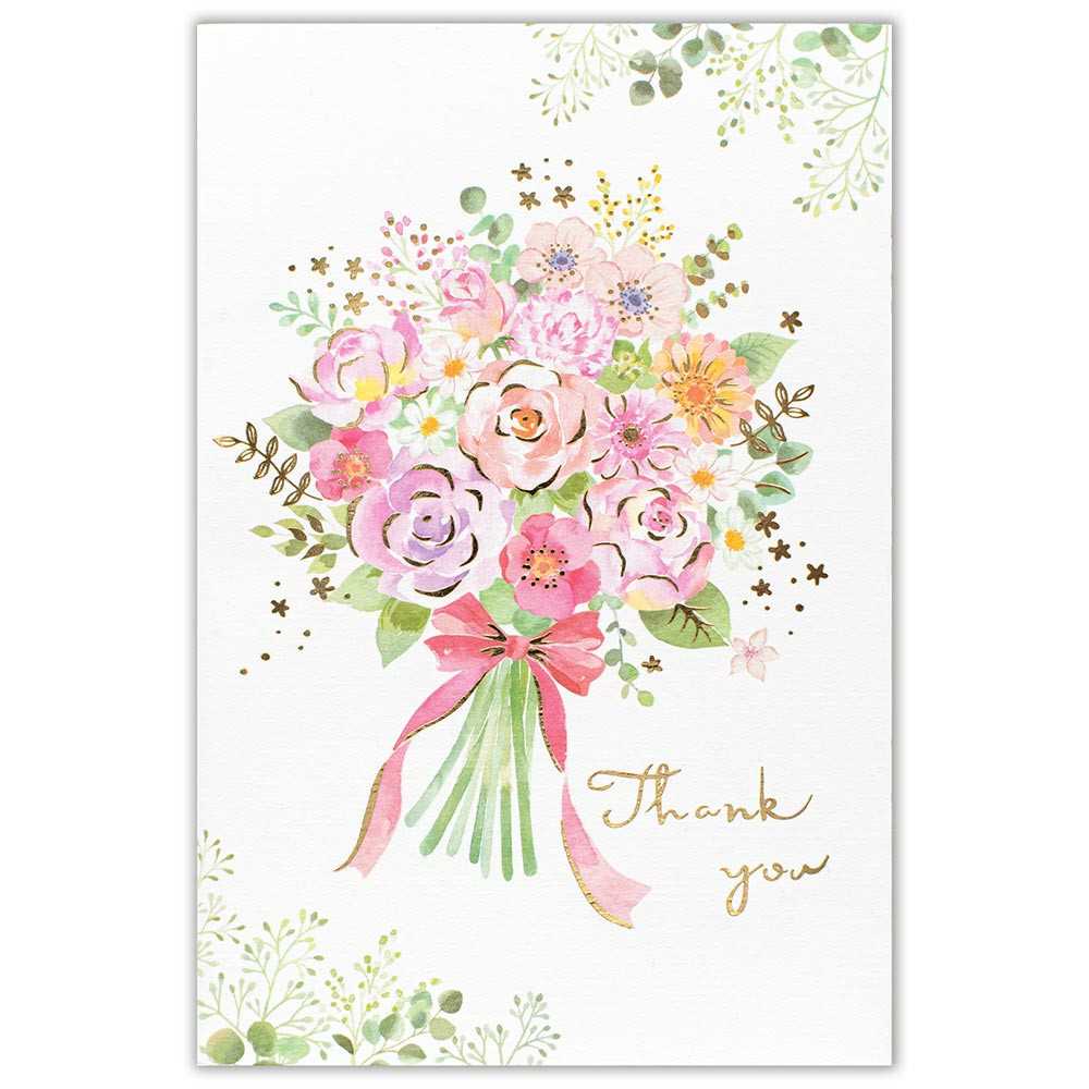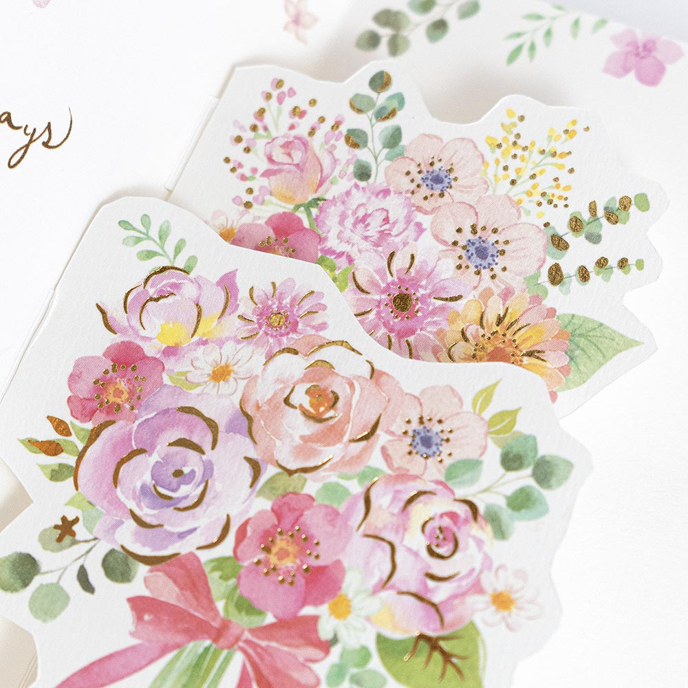 水彩タッチの優しい風合いと、キラリと輝く金箔押し加工が華やかなデザインです。