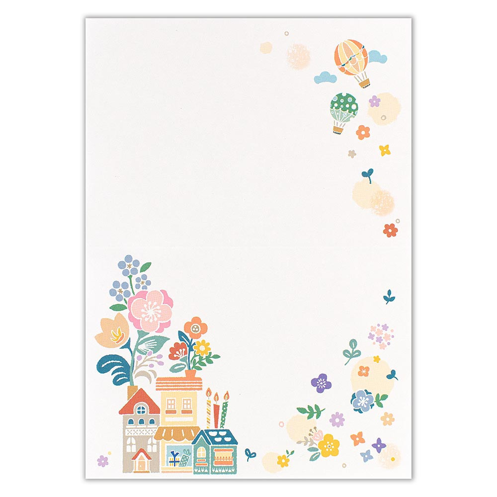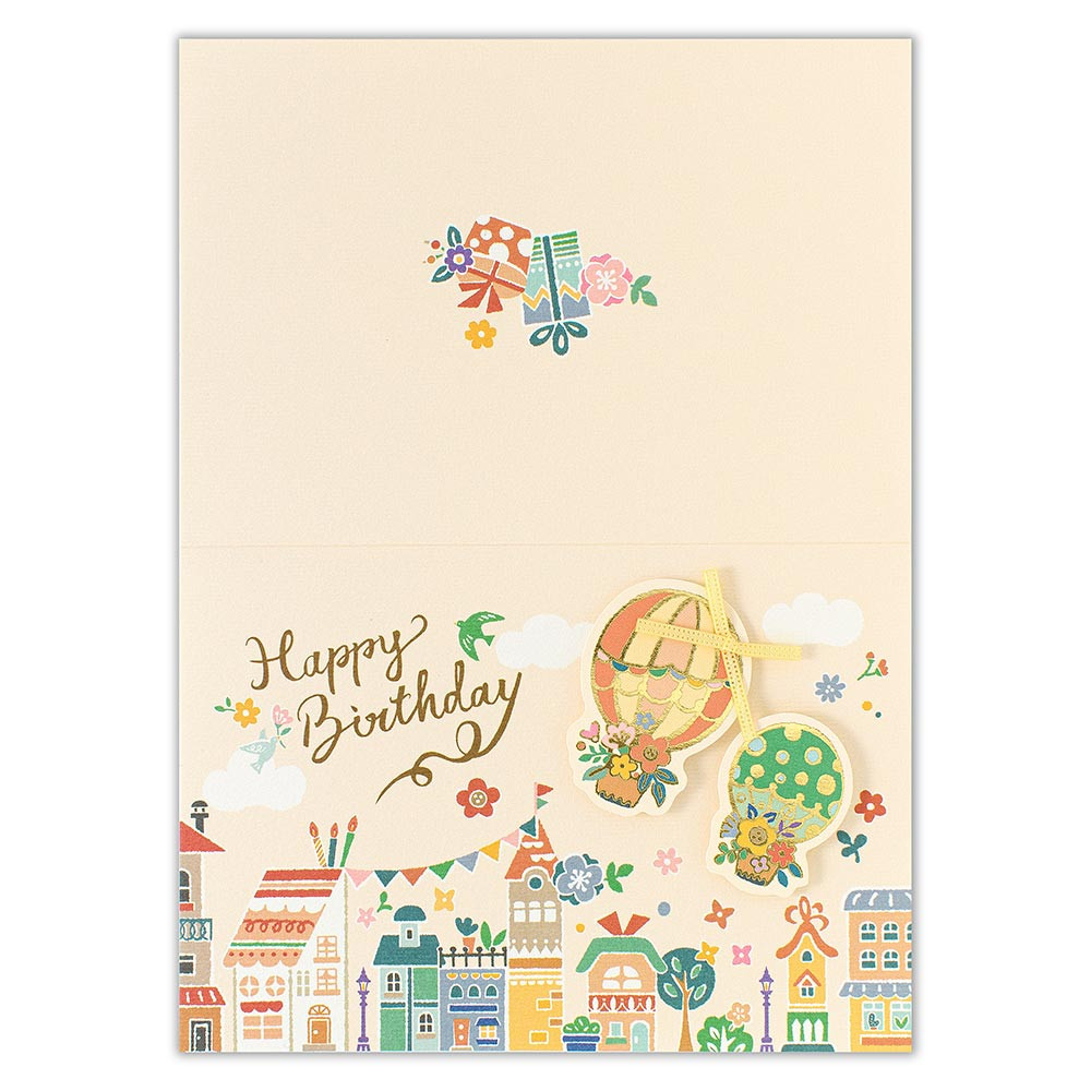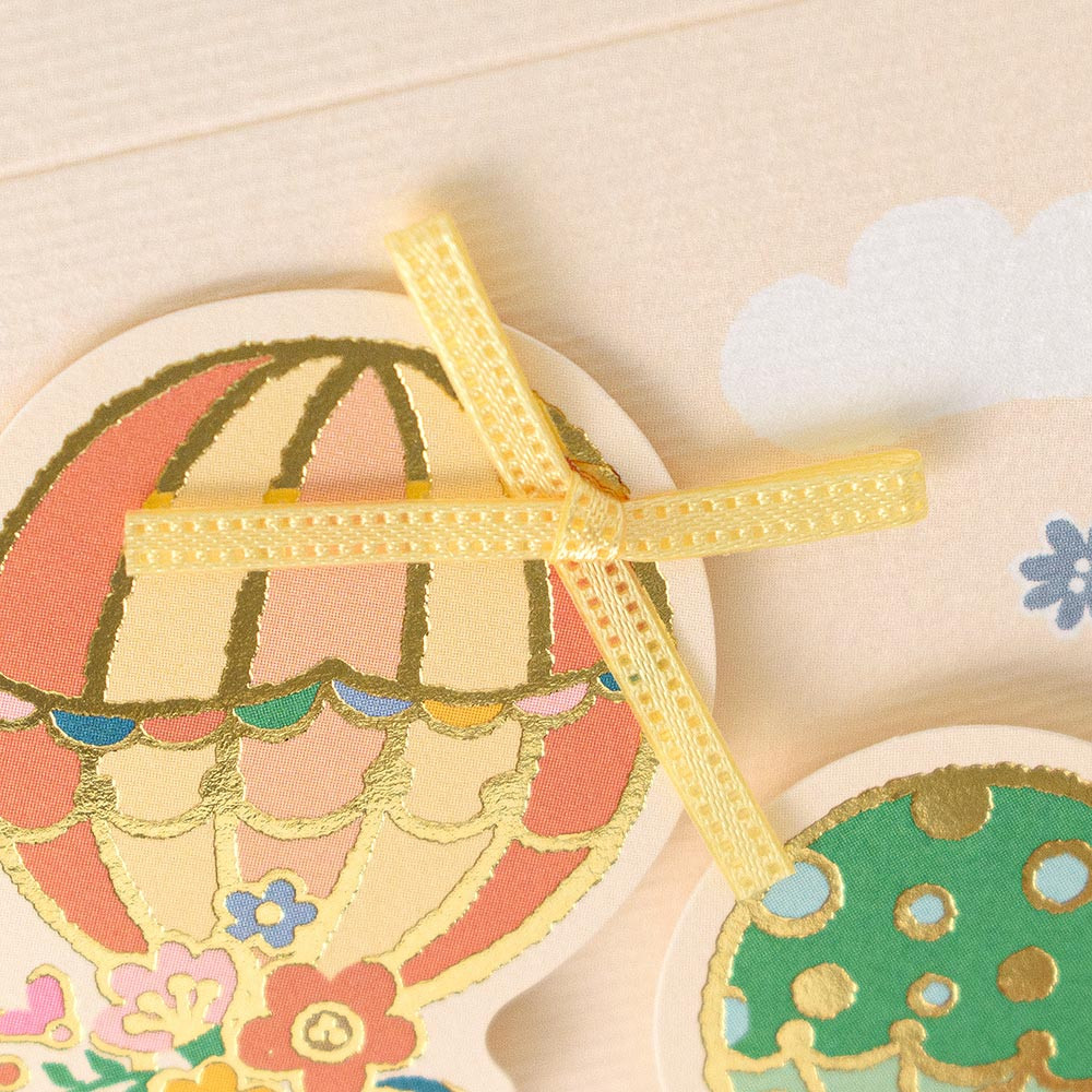 気球と街並みのイラストが華やかにお祝いを彩ります。