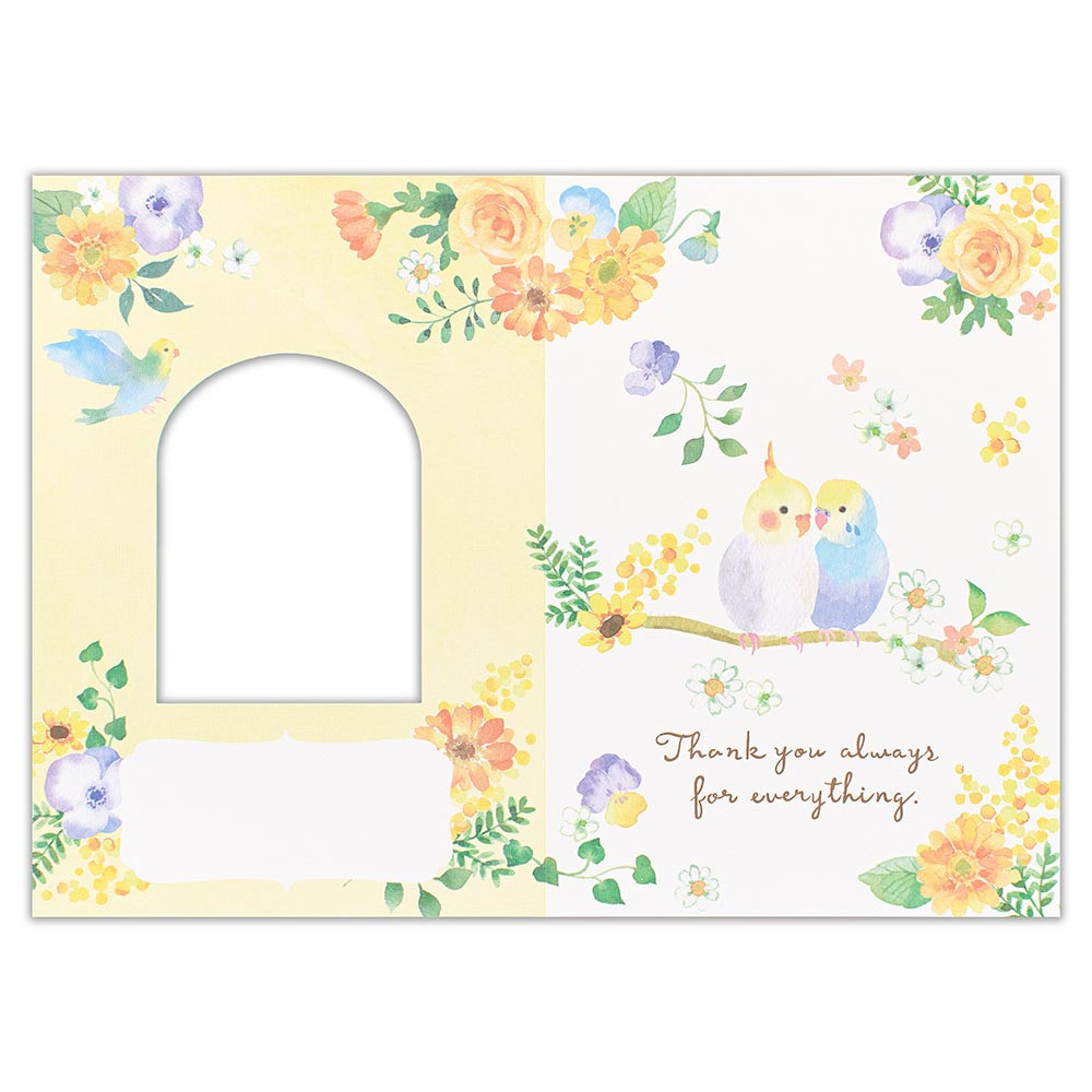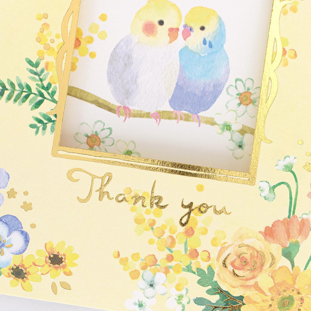 黄色系のお花と寄り添うインコが可愛らしく描かれています。