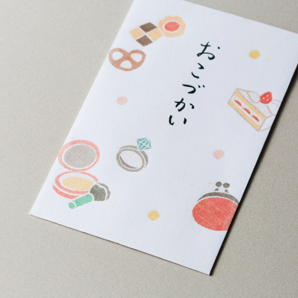 表書きに「おこづかい」と書かれたラメがキラキラと輝く、かわいらしいぽち袋です。女の子が好む柄を揃えました。お子様やお孫さんへのおこづかいに。