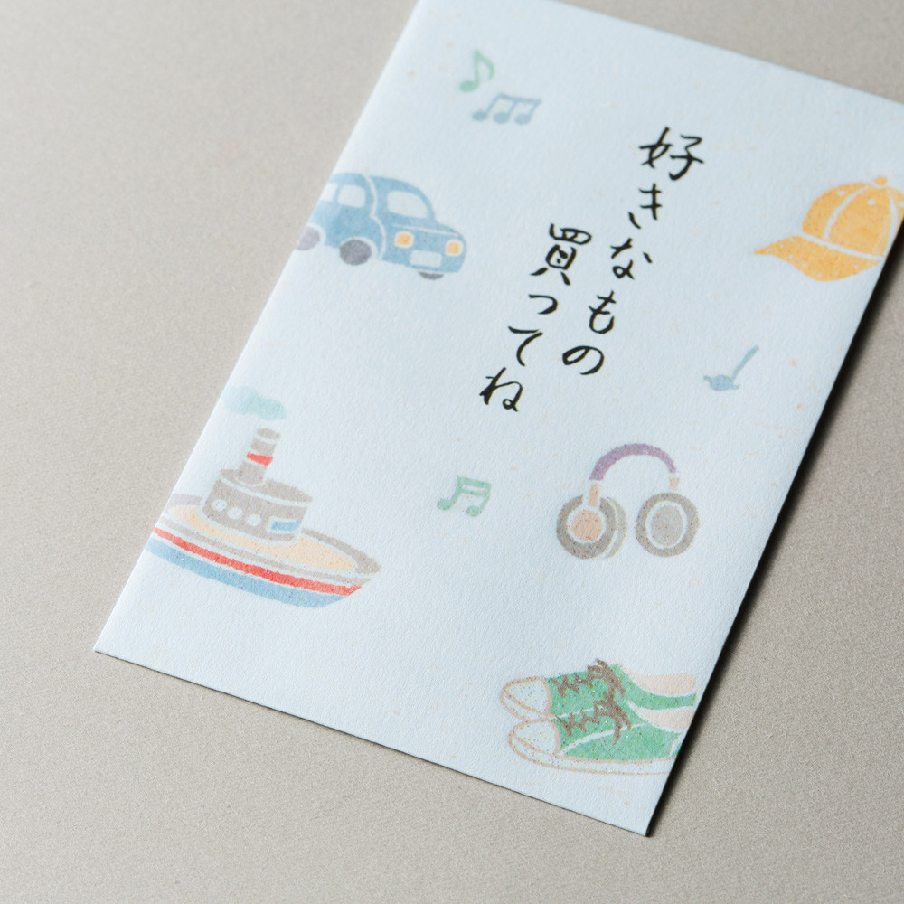 表書きに「好きなもの買ってね」と書かれたラメがキラキラと輝く、かわいらしいぽち袋です。男の子が好む柄を揃えました。お子様やお孫さんへのおこづかいに。