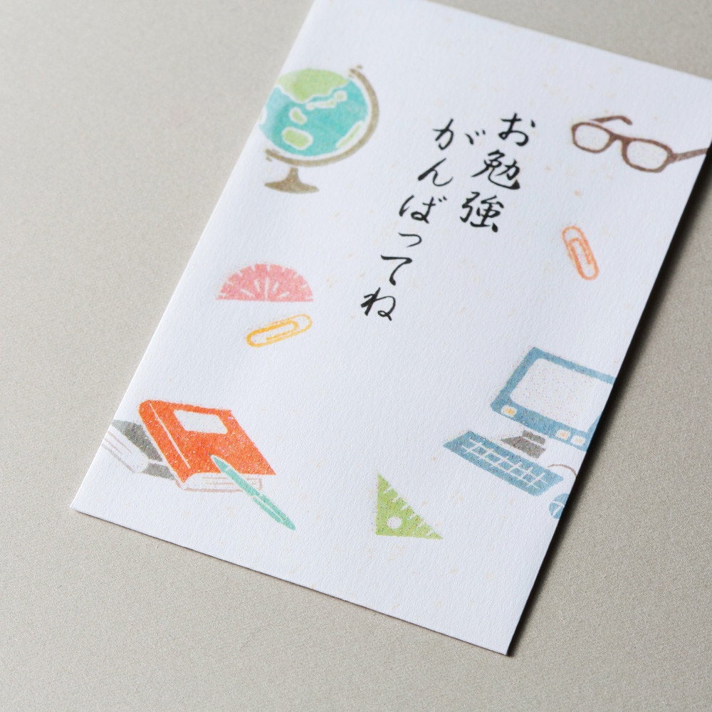 表書きに「お勉強がんばってね」と書かれたラメがキラキラと輝く、かわいらしいぽち袋です。勉強に関連する柄を揃えました。お子様やお孫さんへのおこづかいに。