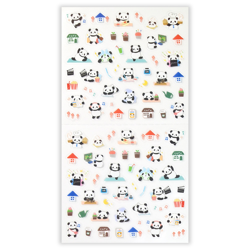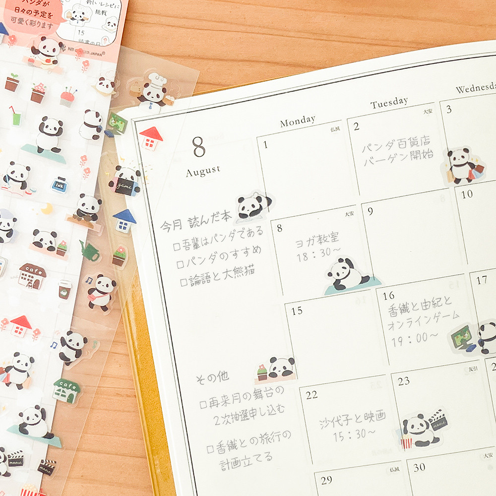 ヨガ、手帳デコ、ゲームや散歩などたくさんの趣味を楽しむパンダを描きました。