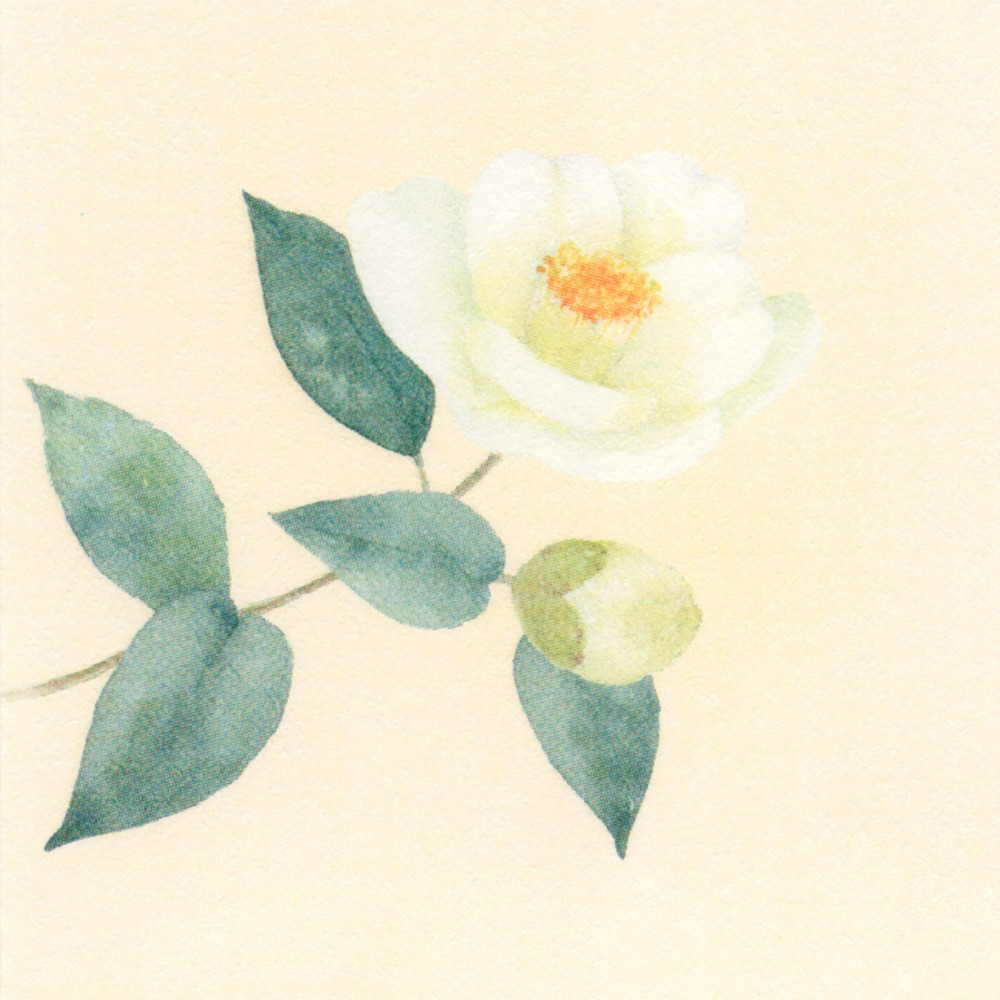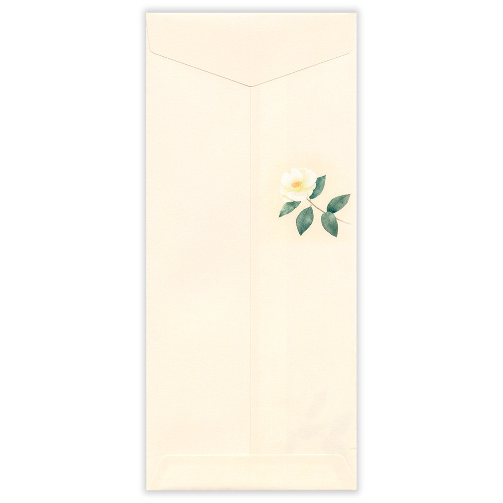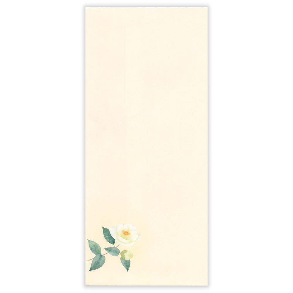 和紙の風合いを感じる冬の季節におすすめの封筒です。 白い椿を水彩で上品に描きました。
