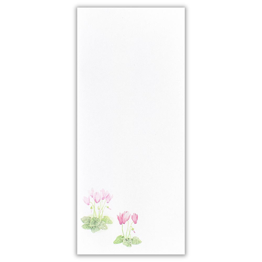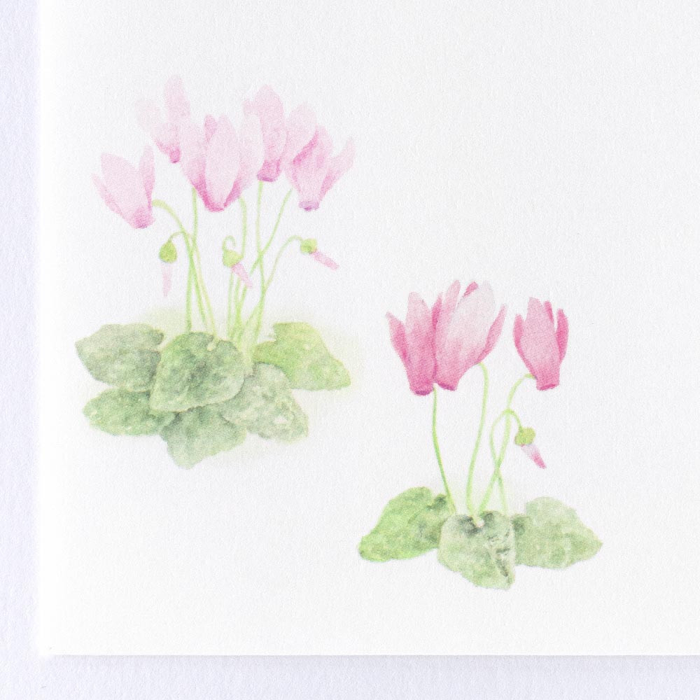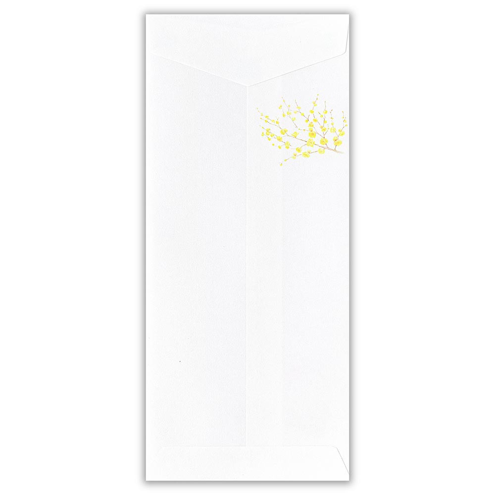 和紙の風合いを感じる冬の季節におすすめの封筒です。 シクラメンと蝋梅を水彩で上品に描きました。