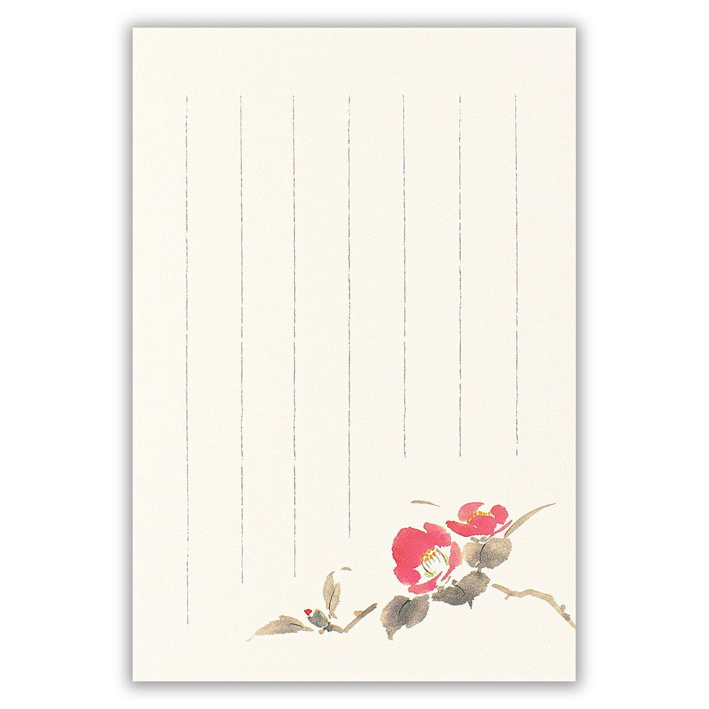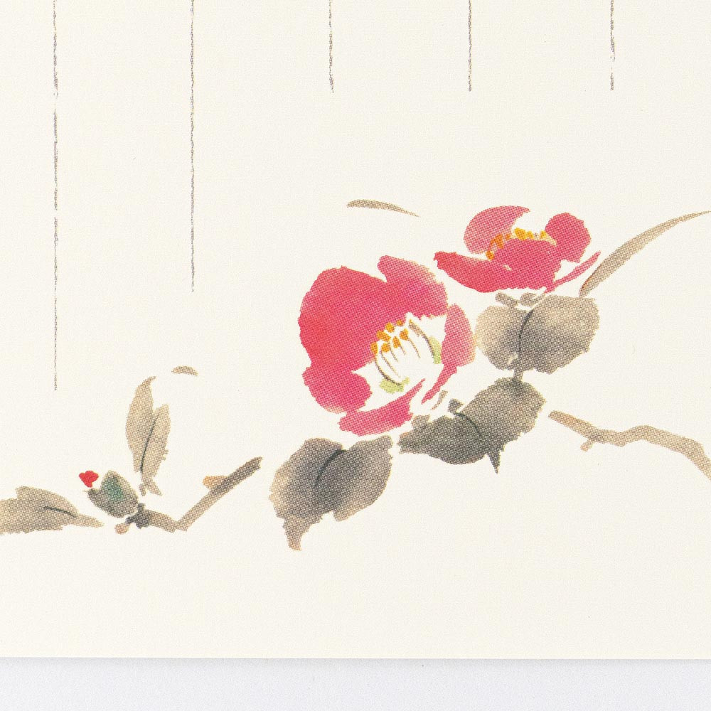 冬の季節におすすめのはがきです。 赤椿を上品に描きました。 落ち着きのあるデザインは、目上の方へのお手紙にもご使用いただけます。