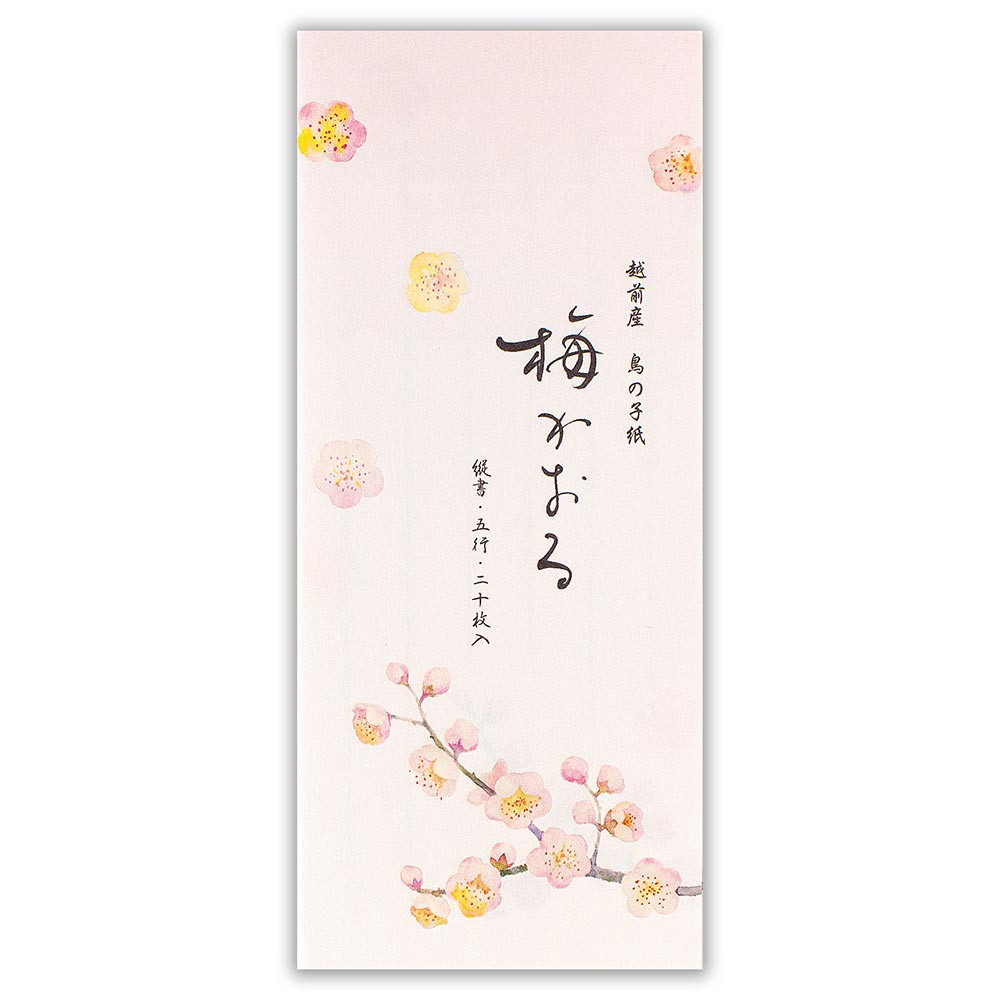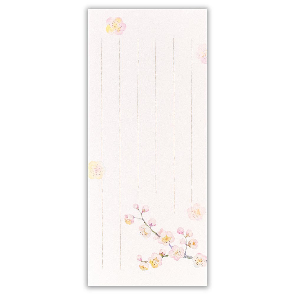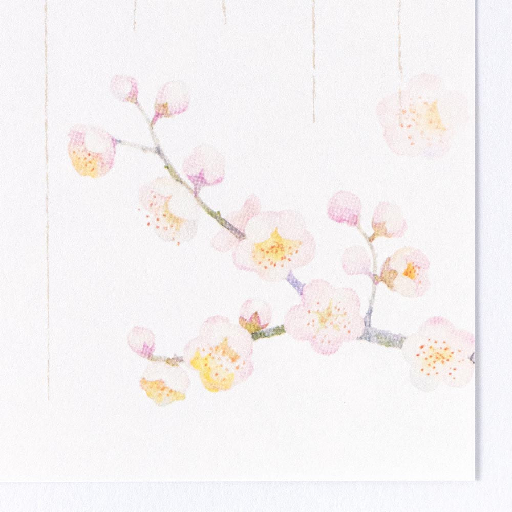 和紙の風合いを感じる冬の季節におすすめの一筆箋です。 梅の花を水彩で上品に描きました。