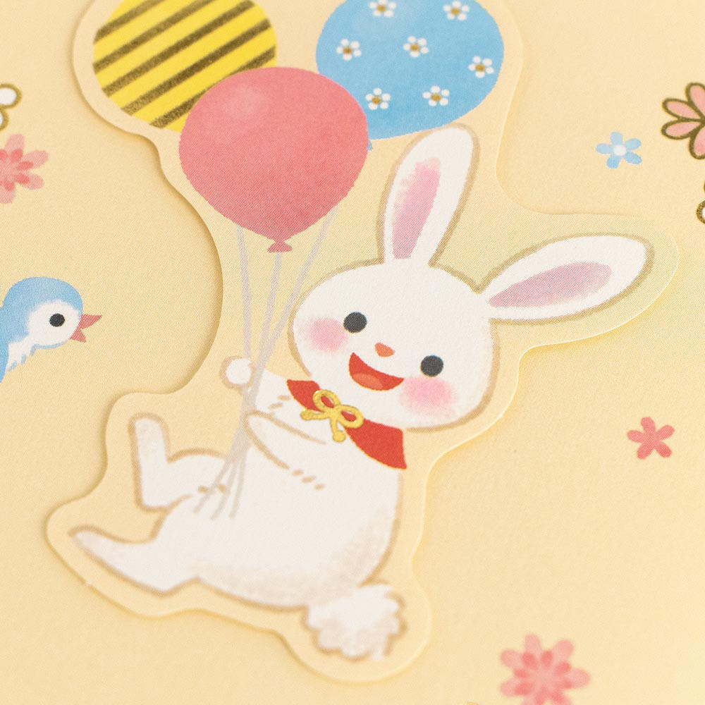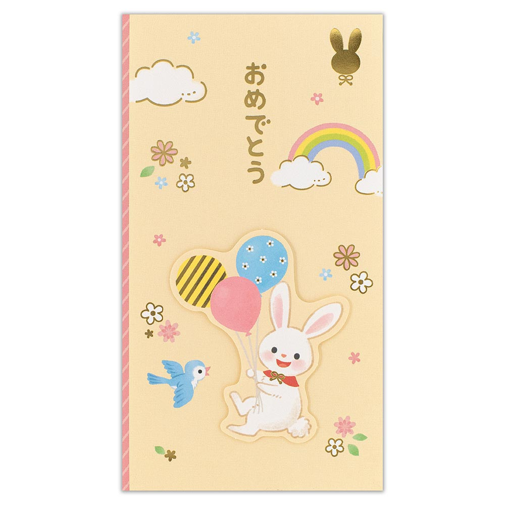 浮かせ貼りパーツのうさぎ、虹、花で可愛く仕上げました。幅広いお祝いにお使いいただけます。