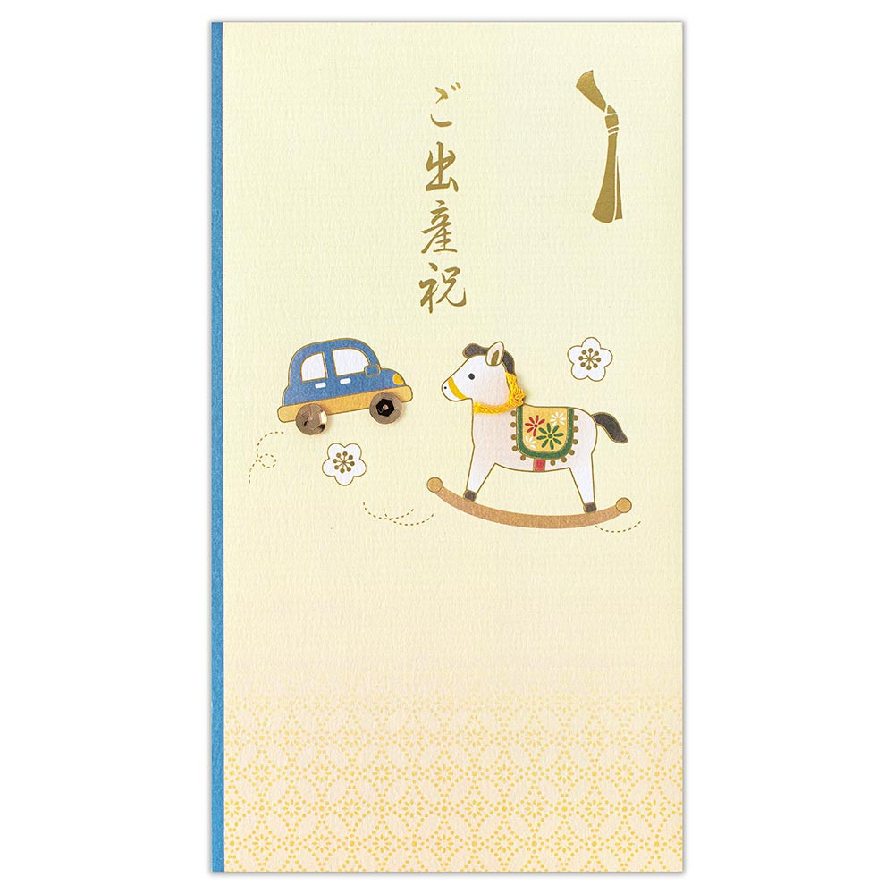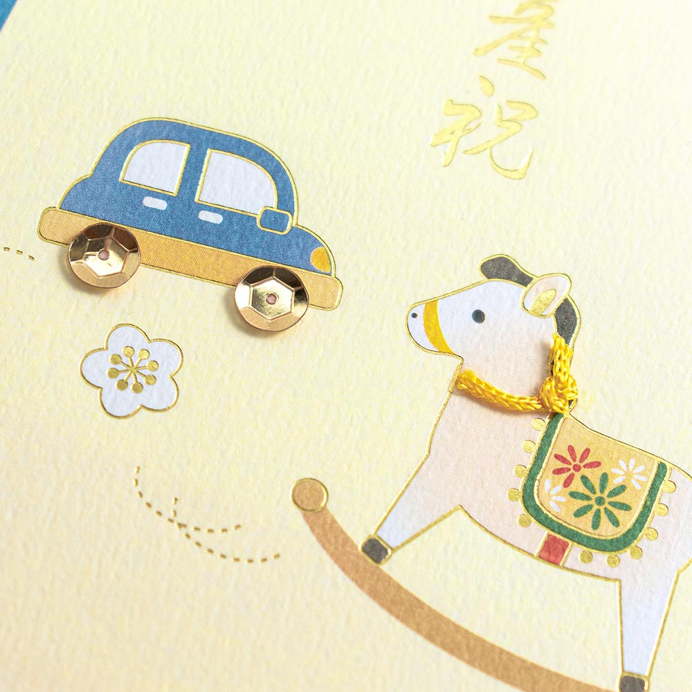 車のタイヤをスパンコール、木馬の首輪を紐で立体的に仕上げ、金箔押し加工の表書きとともに思わず目を引くご出産御祝です。