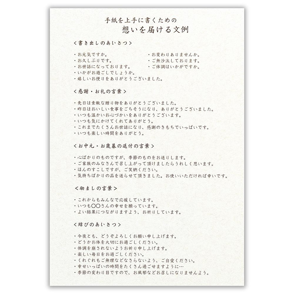 また、書き出しのあいさつや、感謝・お礼の言葉といったお手紙でよく使われる言葉例をまとめた「想いを届ける言葉例」をお付けいたしました。