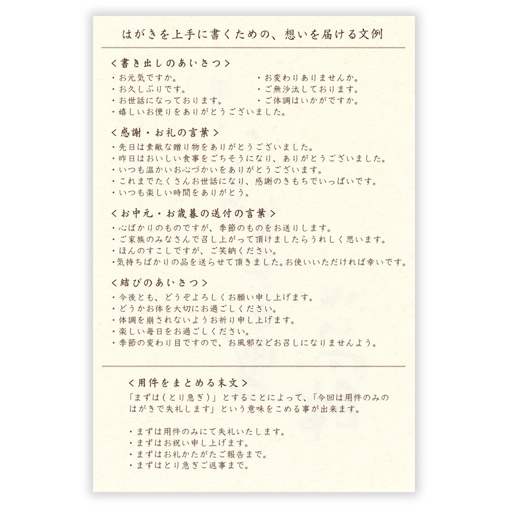 「はがきを上手に書くための、想いを届ける文例」をお付けしました。