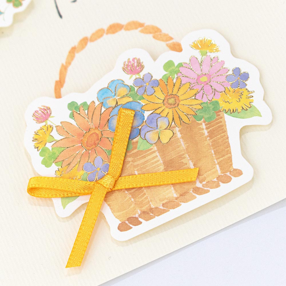 浮かせ貼りのパーツで立体的に仕上げ、アクセントにリボンを付けました。