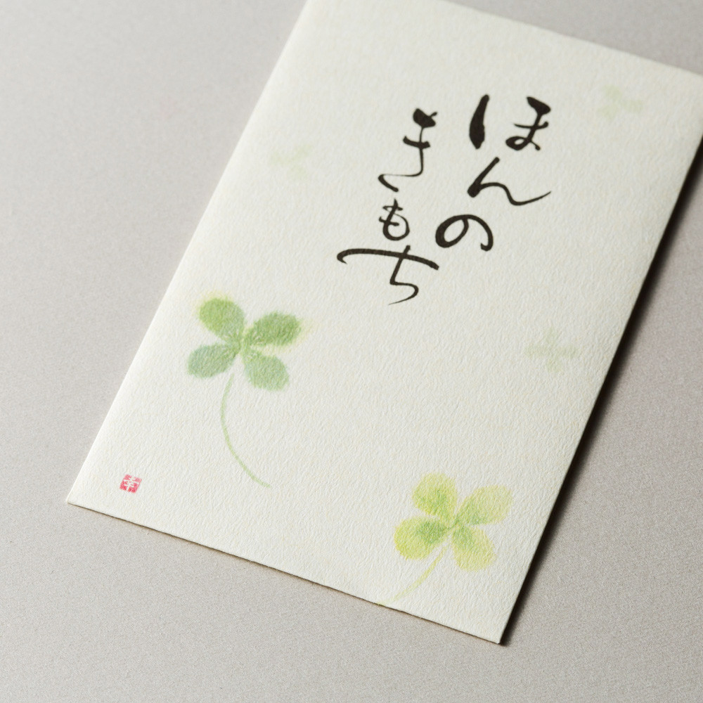 「ほんのきもち」という上品で温かい筆文字の表書きで、気持ちが伝わるぽち袋です。 若々しい四葉のイラスト入りです。 【クローバー】