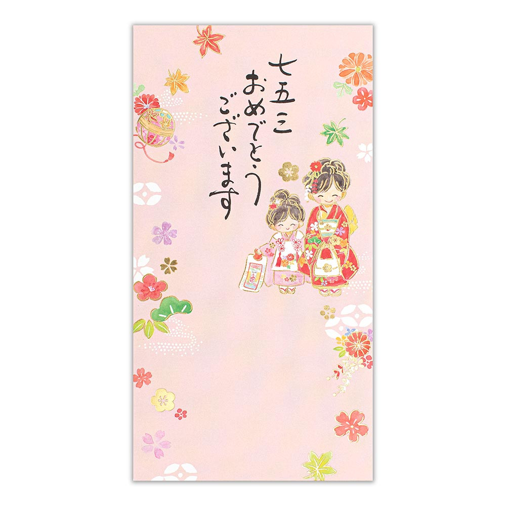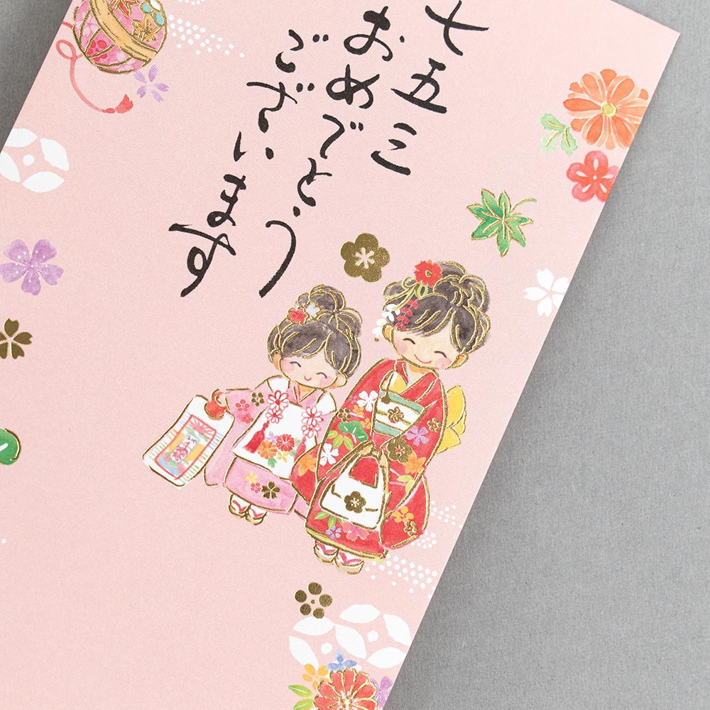あでやかな衣装を着た可愛い3歳と7歳の女の子を描いた可愛らしいデザインです。