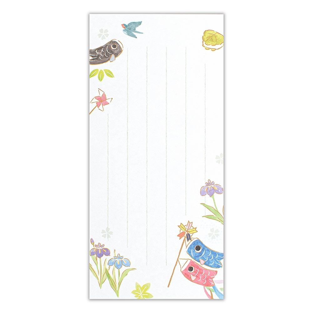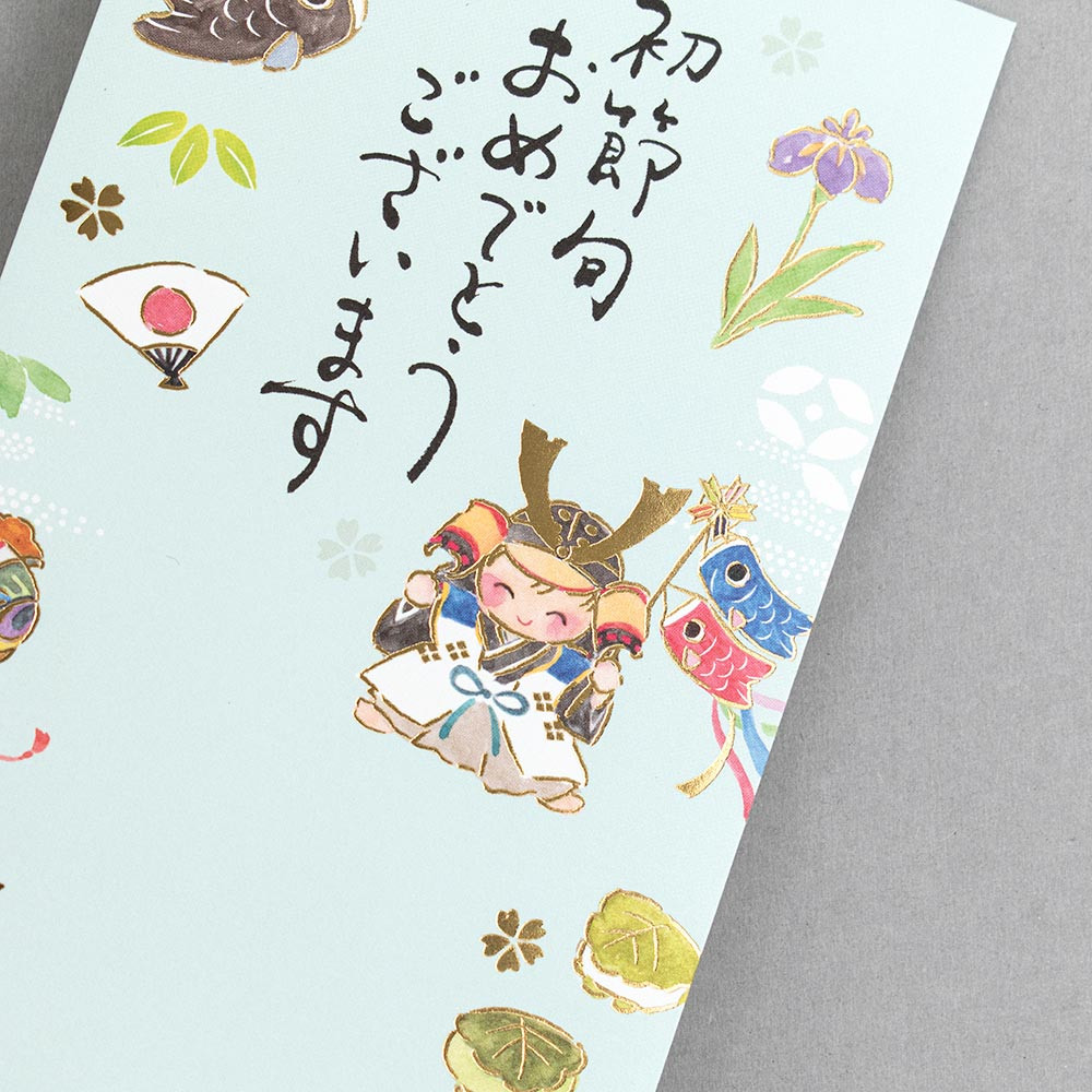 衣装を着た可愛い男の子と、こいのぼりなどを描いた愛らしいデザインです。
