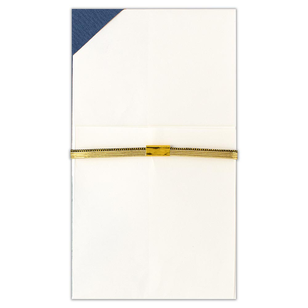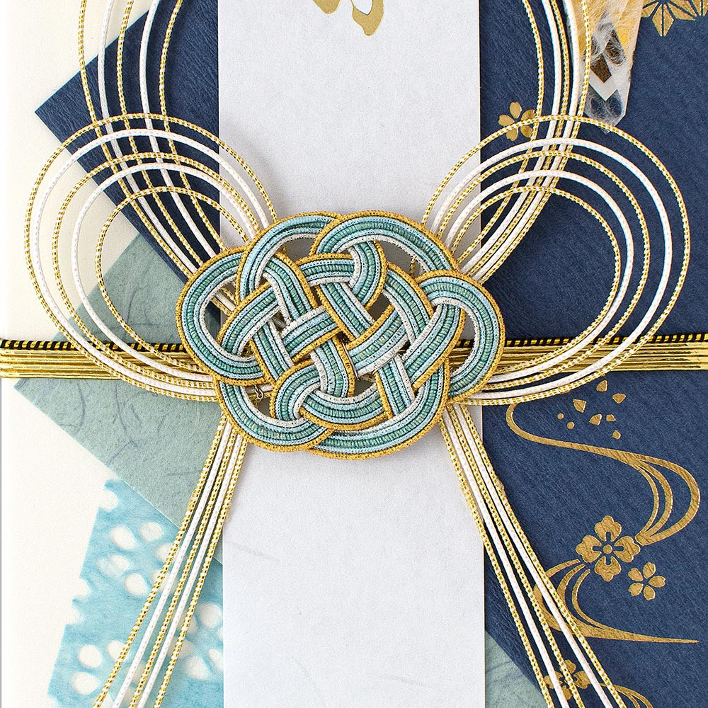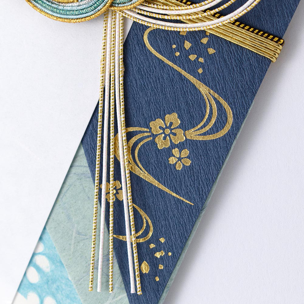 3枚の青色の和紙を貼り、落ち着いたデザインに仕上げました。中心の水引は亀の子結びで長寿の象徴として古くから縁起が良い柄とされています。