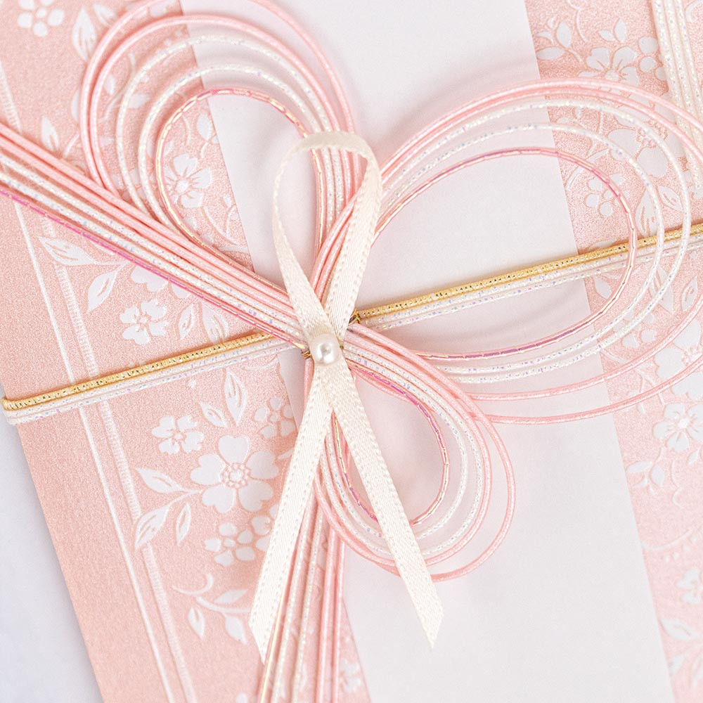 パールシルクの輝きやきらめく水引によって、特別感と上品な可愛らしさを感じさせるデザインに仕上げました。
