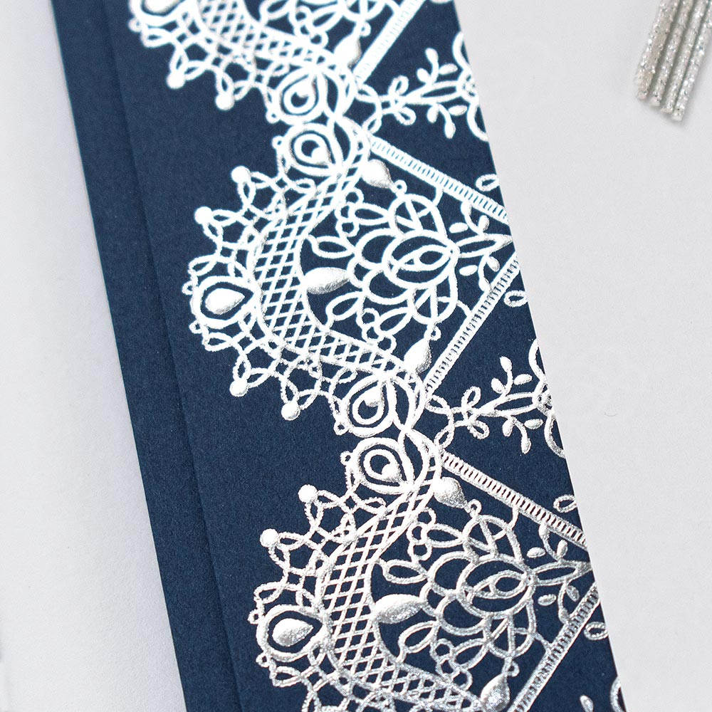 レースのような飾り模様に華やぎを寄せ、ネイビーベースのすっきりとしたデザインに仕上げました。さりげないパールもポイントです。