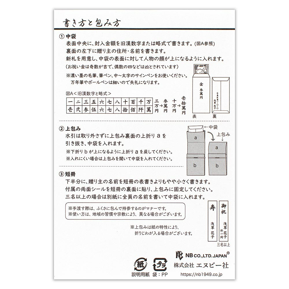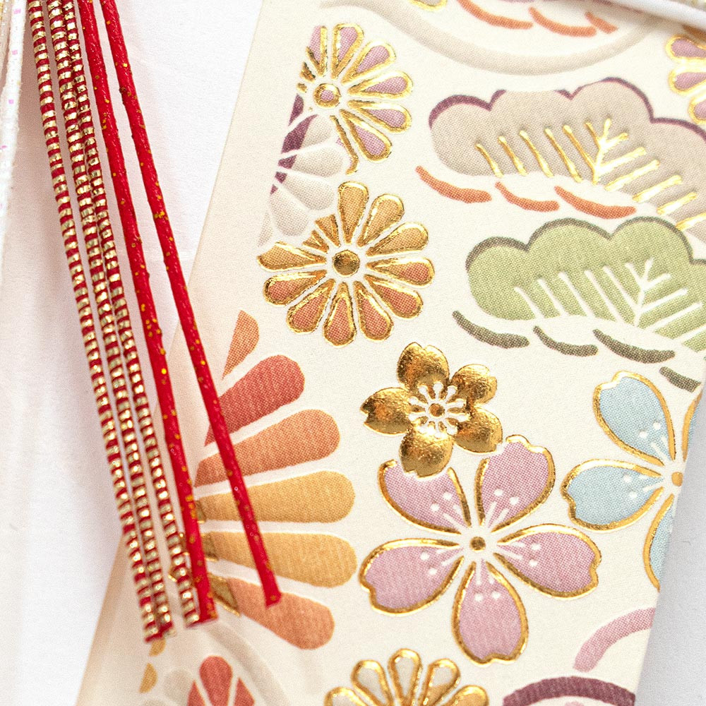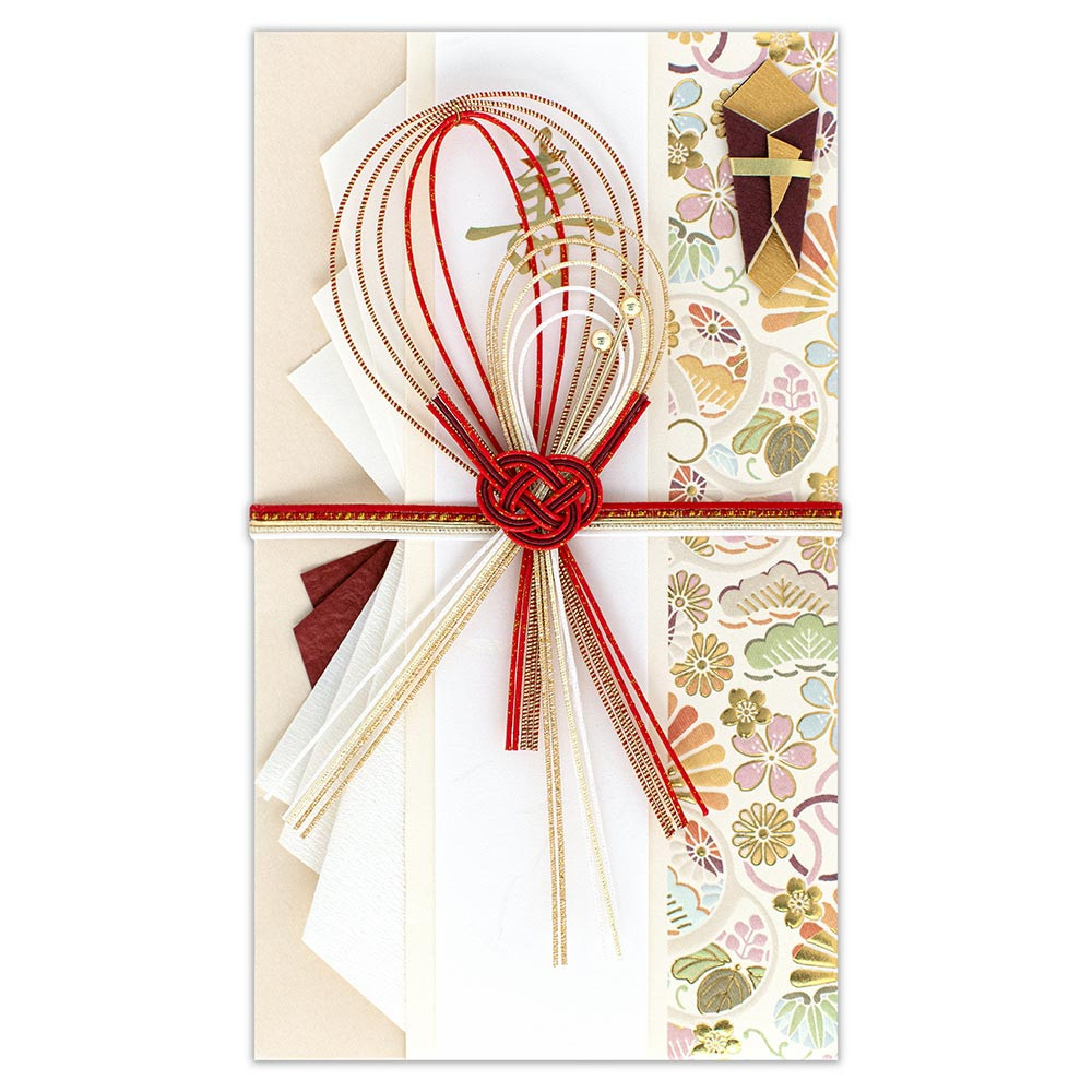 桜・松・菊・葵・梅・桐・扇などの日本古来の紋と、紅白色・金色の水引の輝きが、おめでたい印象を与えます。