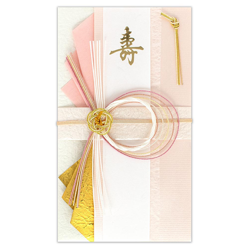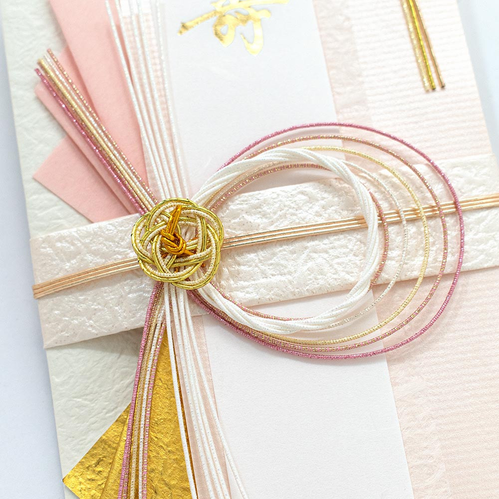 キラキラと輝く淡いピンクの寿金封です。 白とピンクでまとめたシンプルながらも華やかなデザインです。 包む金額の目安は?5万円です。