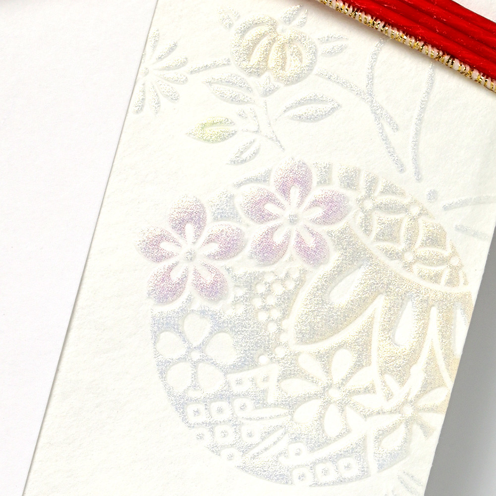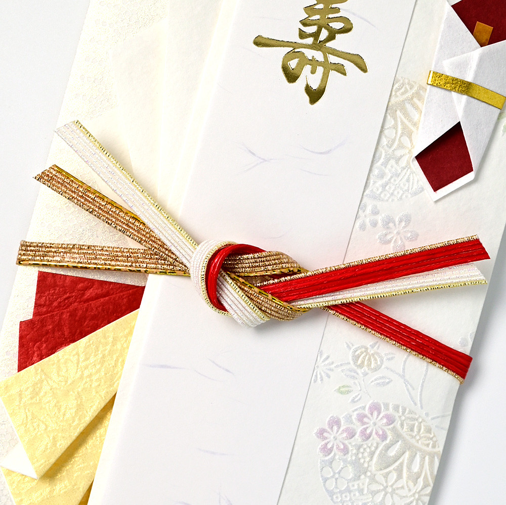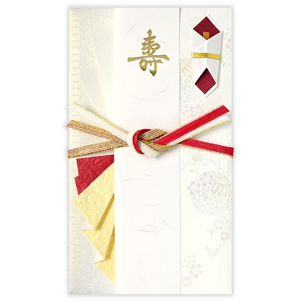 紅白と金の色合いに、繊細な輝きが合わさったモダンな寿金封です。