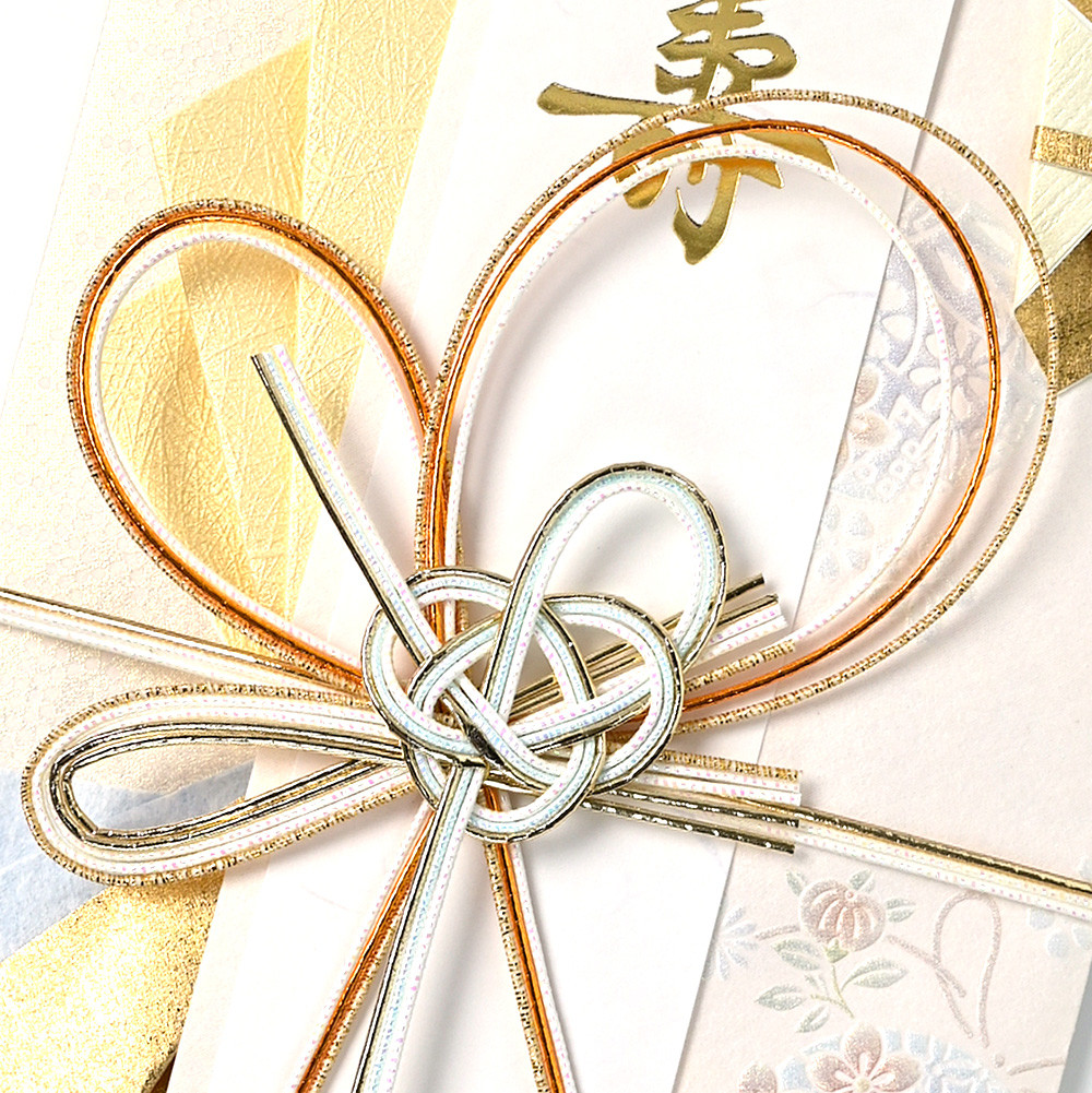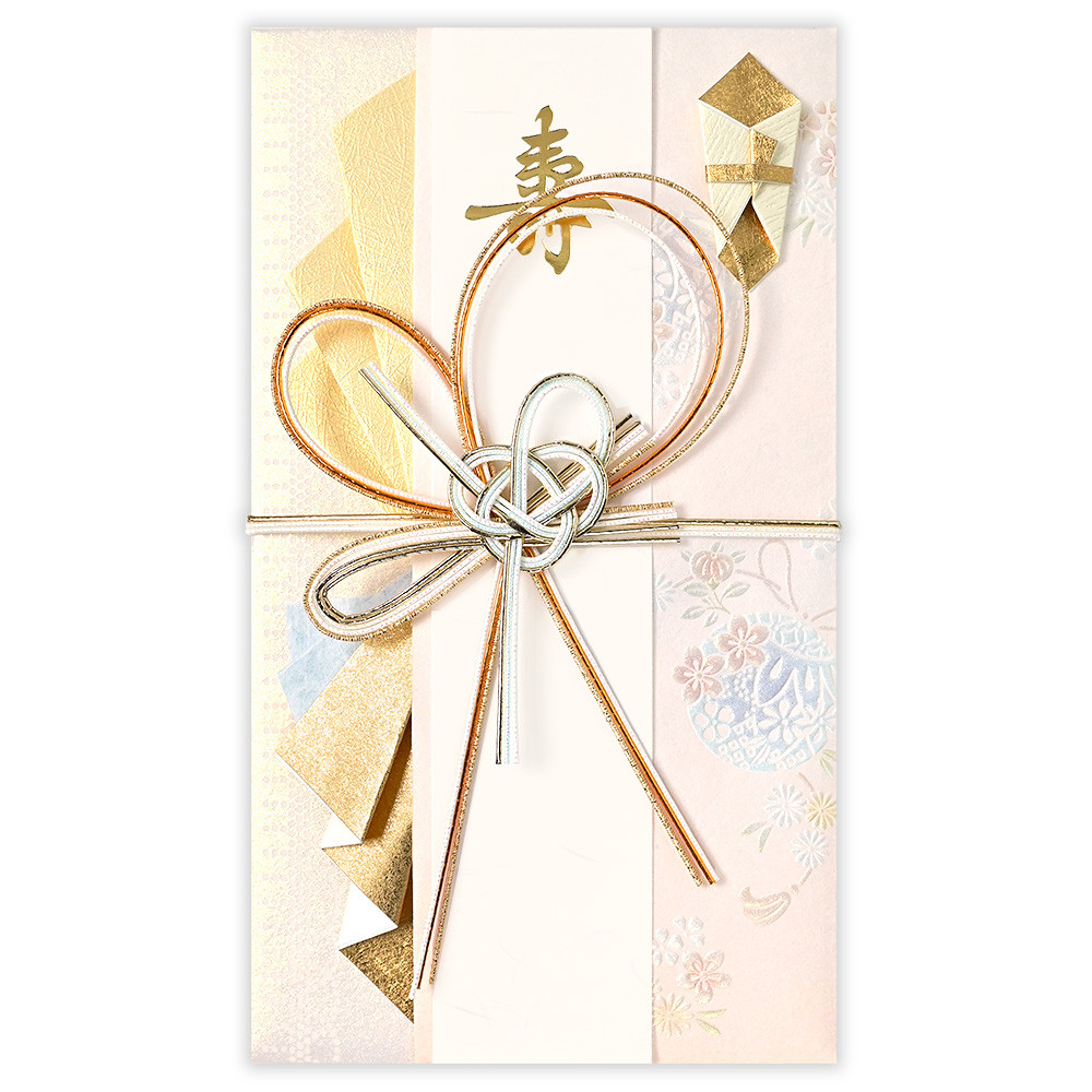 水色や薄桃色など柔らかな色合いに金のアクセントが入った寿金封です。