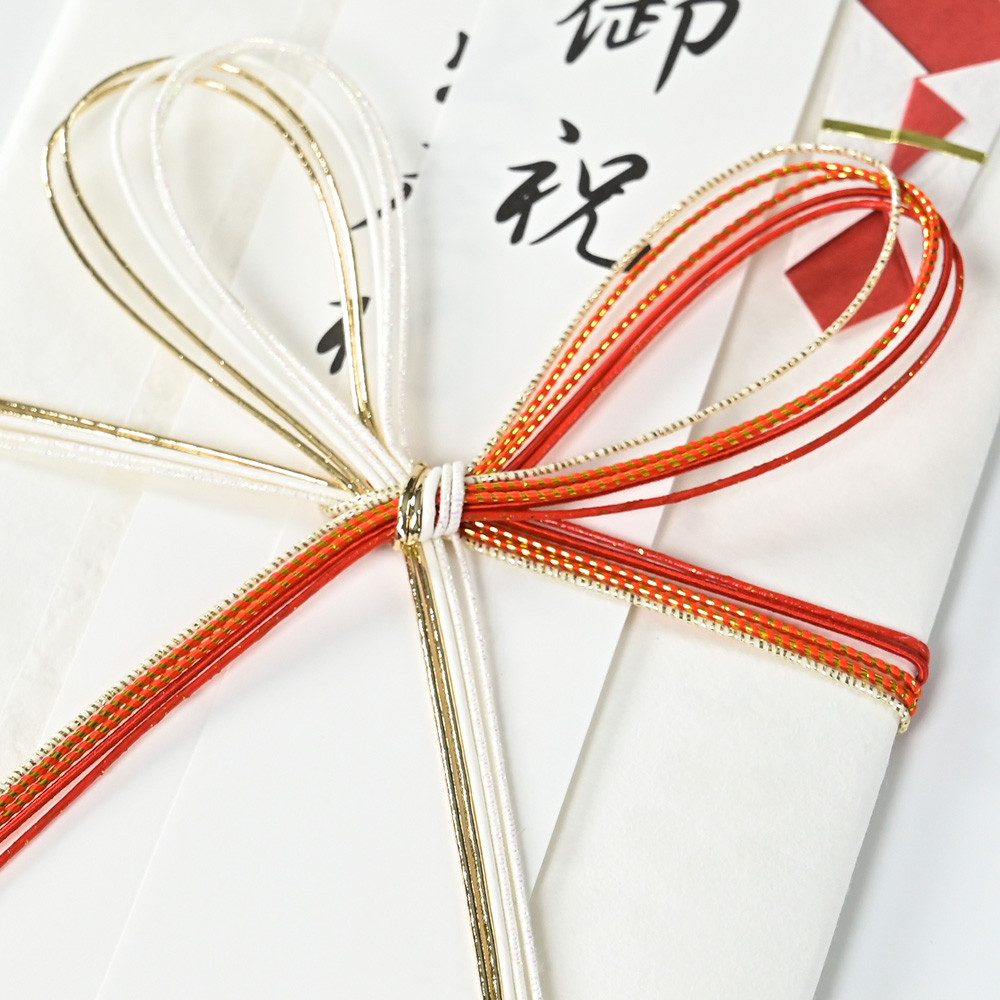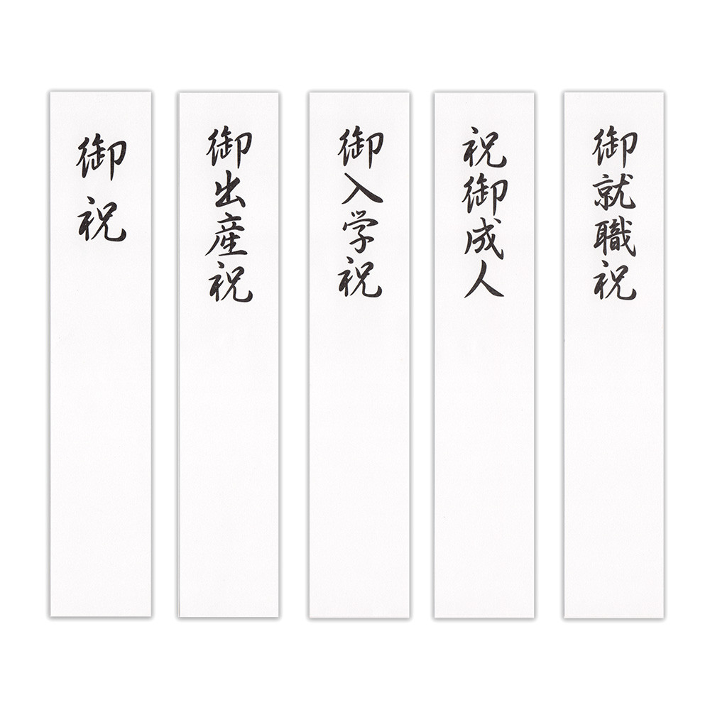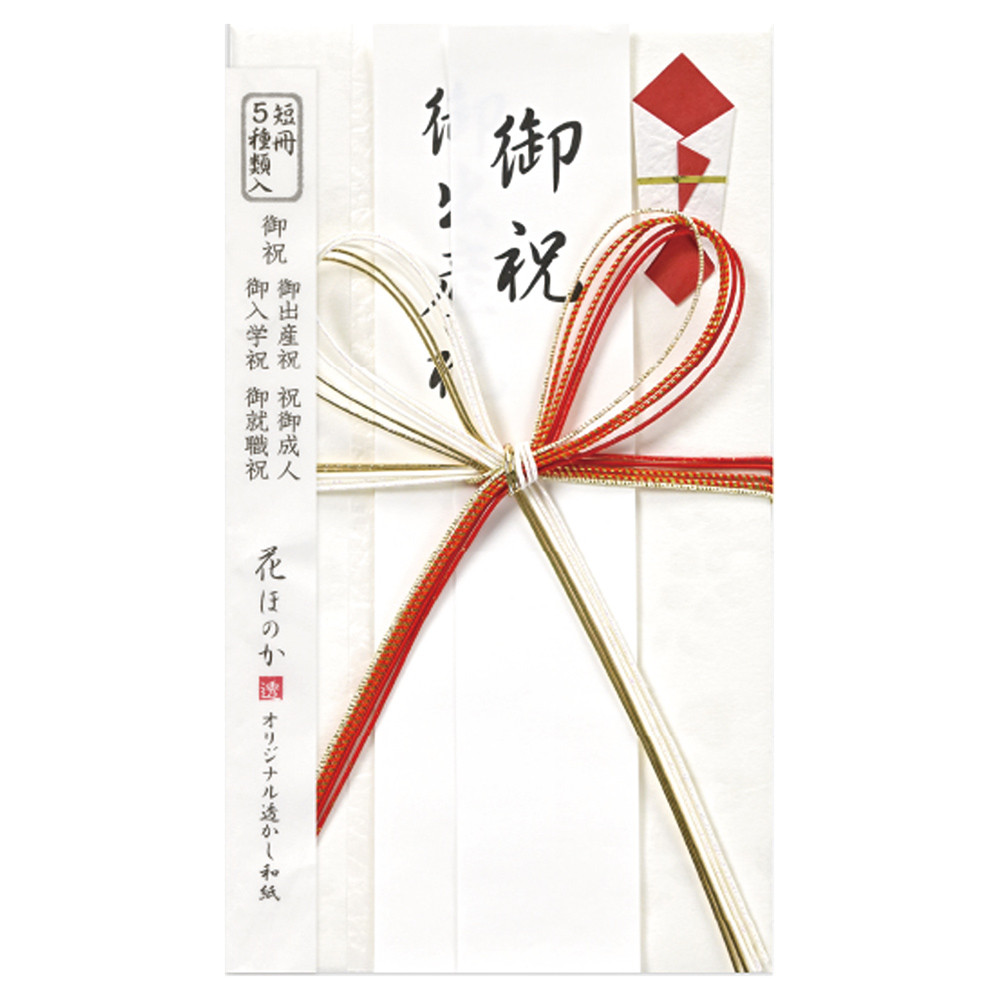 御祝、御出産祝、御入学祝、祝御成人、御就職祝の5種類の短冊入りで、幅広い慶事にお使いいただけます。包む金額の目安は1万円~です。