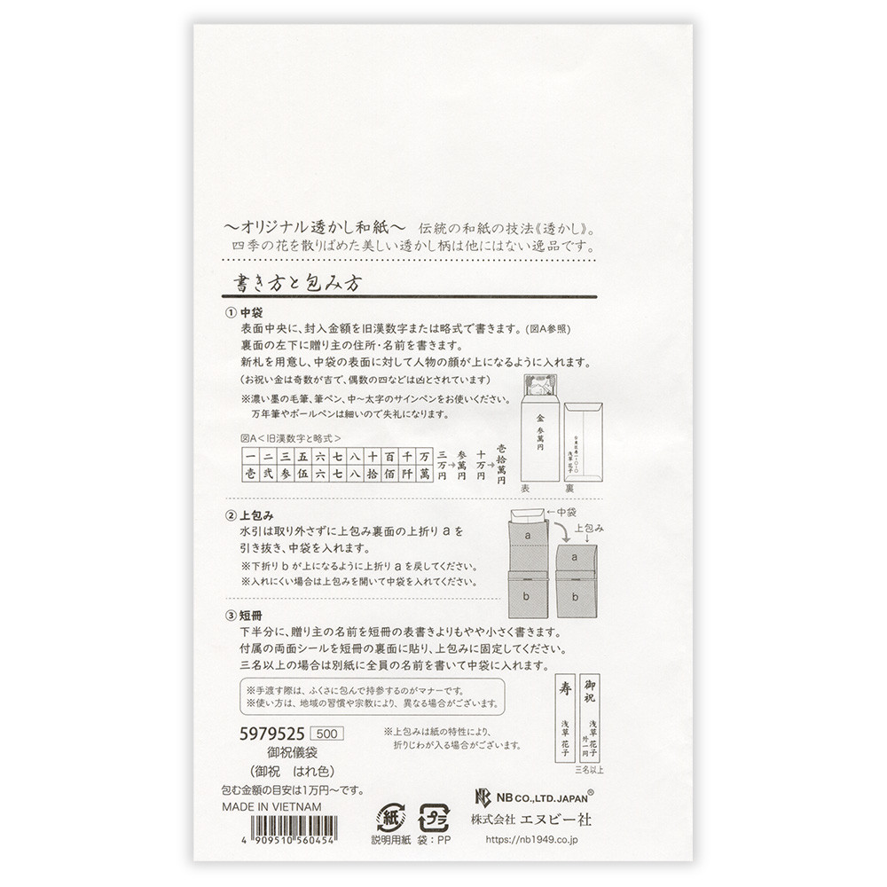 優しい色合いとオリジナルの透かし和紙が上品な雰囲気の御祝儀袋です。伝統の和紙の技法【透かし】により、四季の花を散りばめた美しい透かし柄は他にはない逸品です。自社オリジナルで漉いた和紙を使用しています。