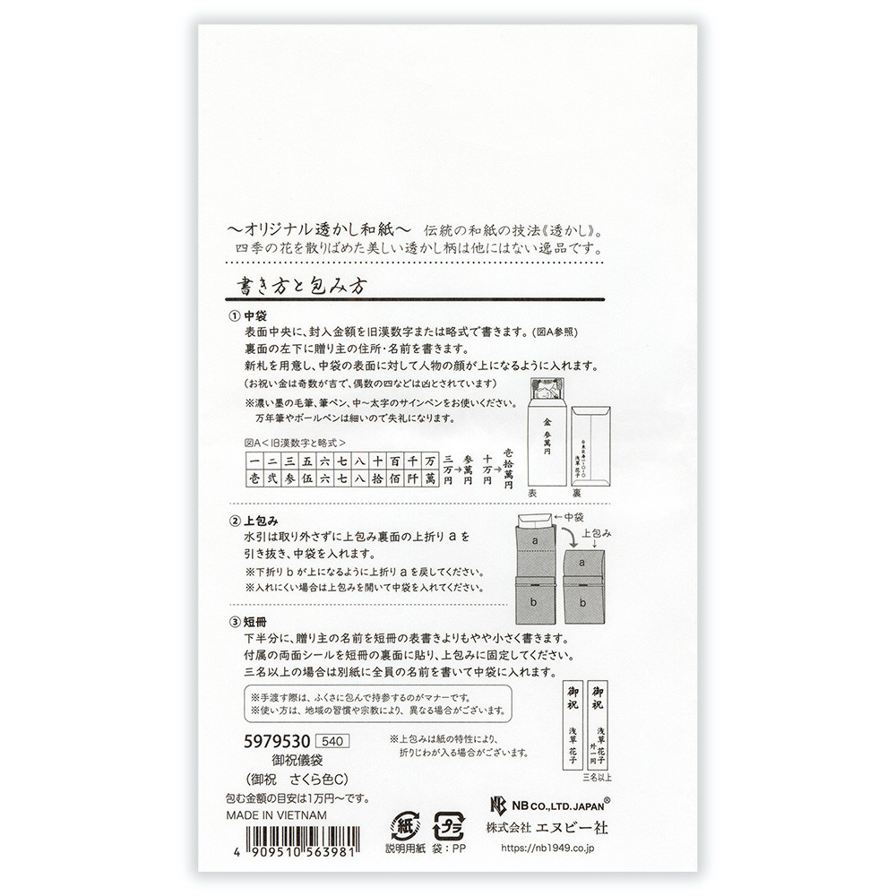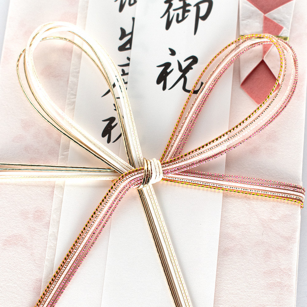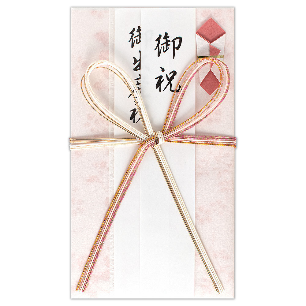 御祝、御出産祝、御入学祝、祝御成人、御就職祝の5種類の短冊入りで、幅広い慶事にお使いいただけます。包む金額の目安は1万円~です。